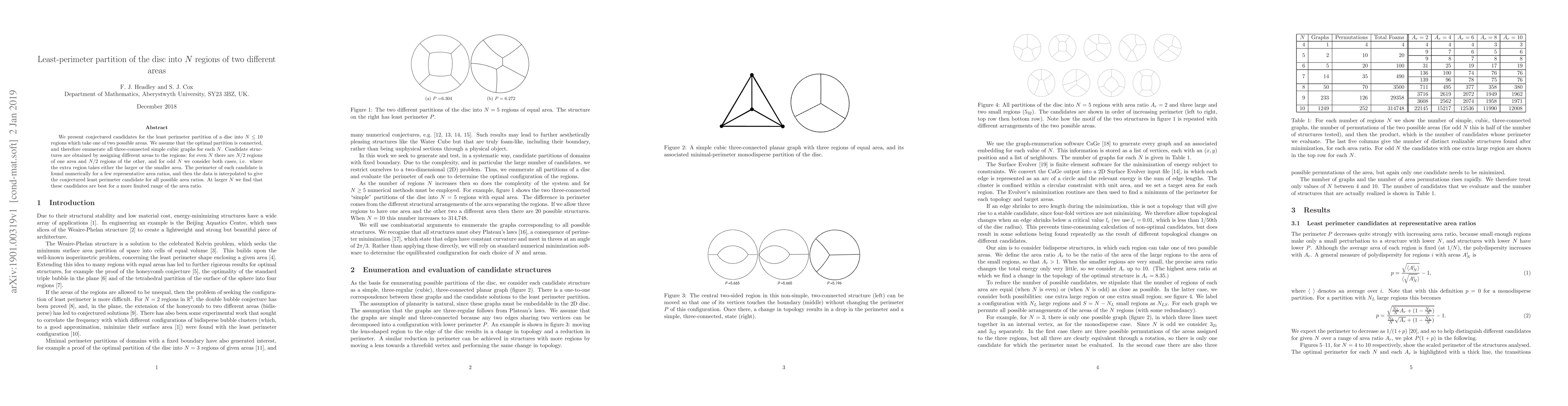 We present conjectured candidates for the least perimeter partition of a disc into $N \le 10$ regions which take one of two possible areas. We assume that the optimal partition is connected, and therefore enumerate all three-connected simple cubic graphs for each $N$. Candidate structures are obtained by assigning different areas to the regions: for even $N$ there are $N/2$ regions of one area and $N/2$ regions of the other, and for odd $N$ we consider both cases, i.e. where the extra region takes either the larger or the smaller area. The perimeter of each candidate is found numerically for a few representative area ratios, and then the data is interpolated to give the conjectured least perimeter candidate for all possible area ratios. At larger $N$ we find that these candidates are best for a more limited range of the area ratio.