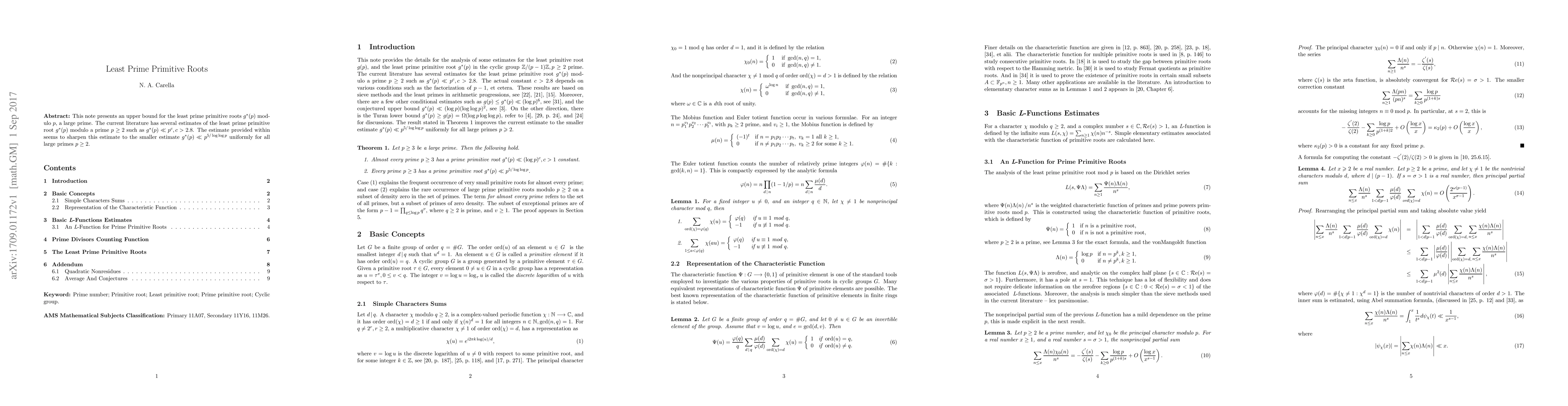 This note presents an upper bound for the least prime primitive roots $g^*(p)$ modulo $p$, a large prime. The current literature has several estimates of the least prime primitive root $g^*(p)$ modulo a prime $p\geq 2$ such as $g^*(p)\ll p^c, c>2.8$. The estimate provided within seems to sharpen this estimate to the smaller estimate $g^*(p)\ll p^{5/\log \log p}$ uniformly for all large primes $p\geq 2$.