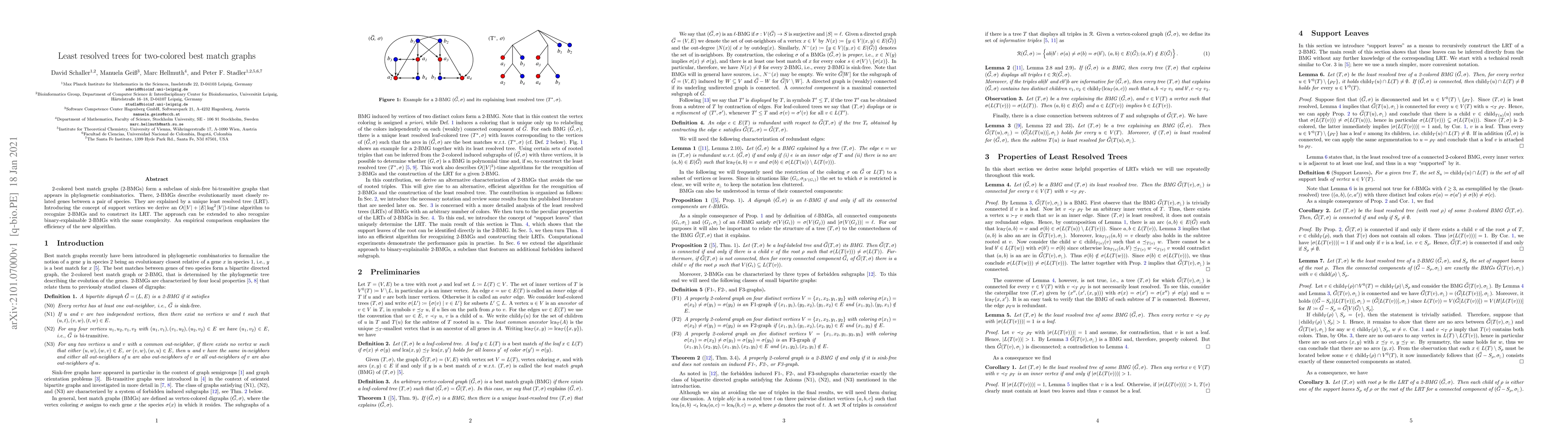 2-colored best match graphs (2-BMGs) form a subclass of sink-free bi-transitive graphs that appears in phylogenetic combinatorics. There, 2-BMGs describe evolutionarily most closely related genes between a pair of species. They are explained by a unique least resolved tree (LRT). Introducing the concept of support vertices we derive an $O(|V|+|E|\log^2|V|)$-time algorithm to recognize 2-BMGs and to construct its LRT. The approach can be extended to also recognize binary-explainable 2-BMGs with the same complexity. An empirical comparison emphasizes the efficiency of the new algorithm.