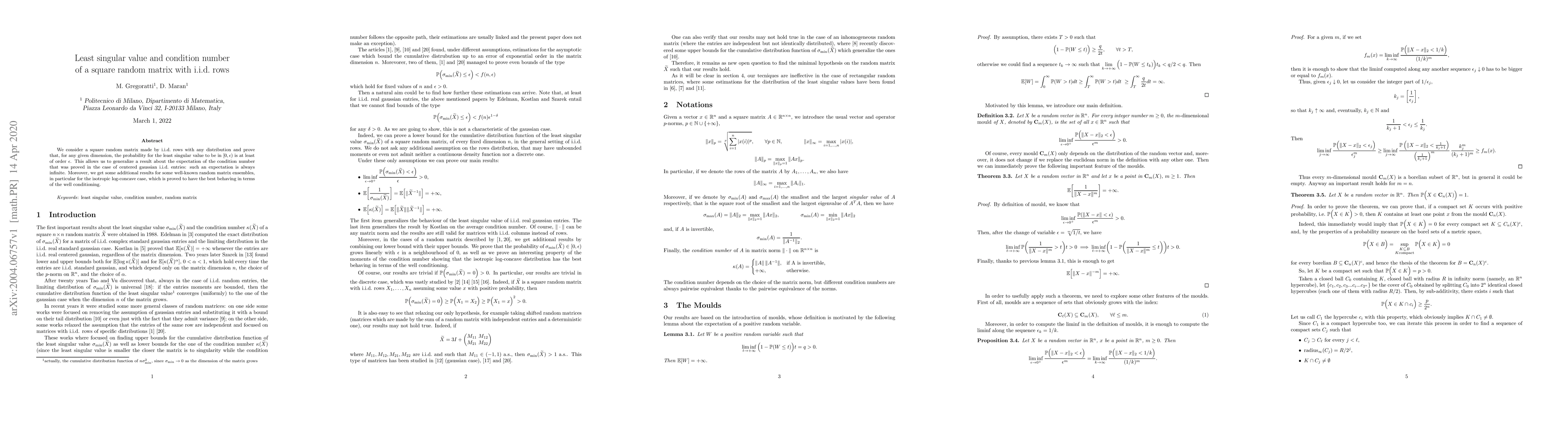 A new study shows that the probability of a square random matrix with i.i.d. rows having its least singular value within a certain range is at least 0.1 times that range. This finding generalizes a previous result on condition numbers in Gaussian matrices.
