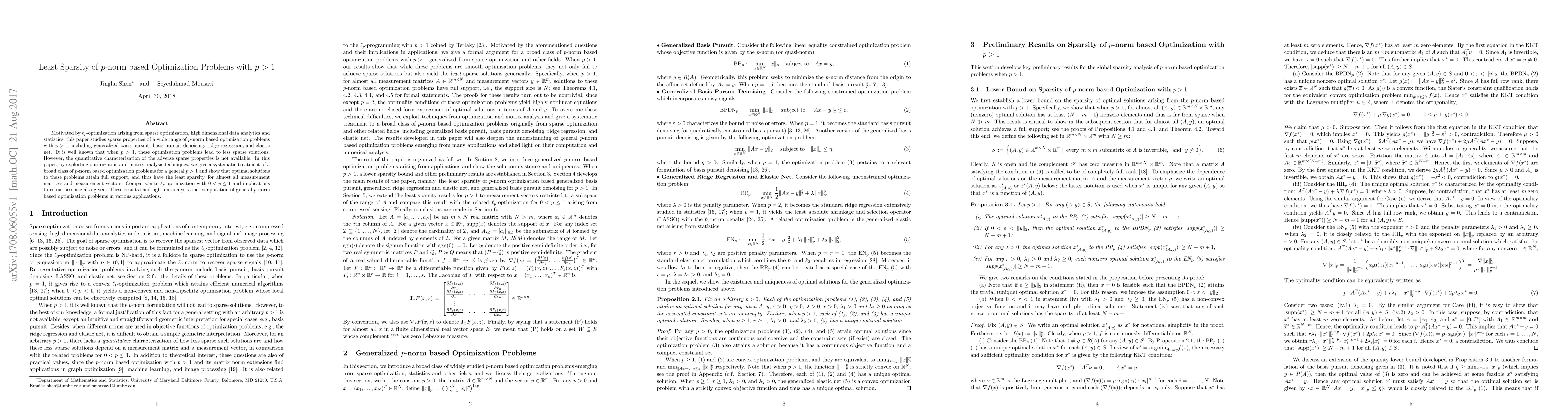 This paper studies the sparsity of $p$-norm based optimization problems with $p > 1$, showing that optimal solutions have the least sparsity for almost all measurement matrices and vectors.