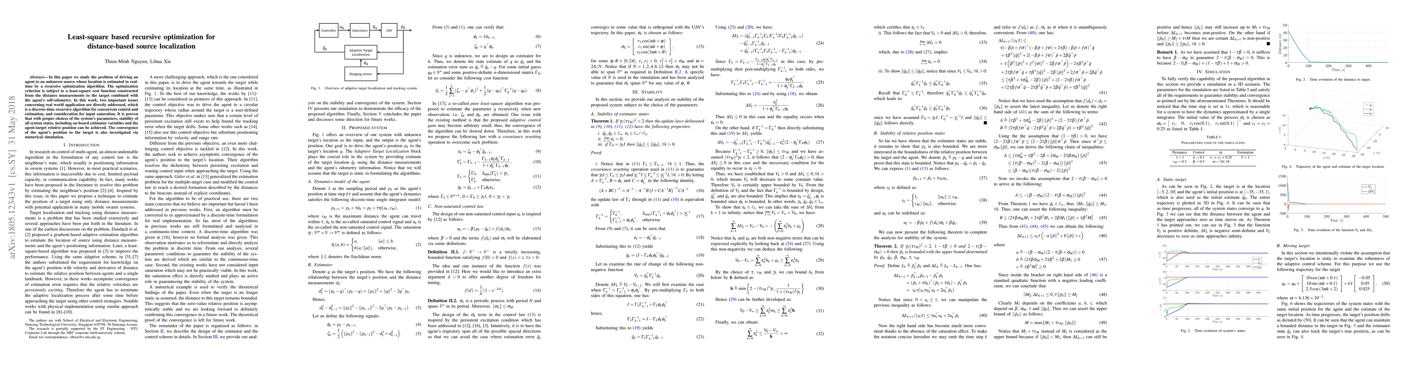 In this paper we study the problem of driving an agent to an unknown source whose location is estimated in real-time by a recursive optimization algorithm. The optimization criterion is subject to a least-square cost function constructed from the distance measurements to the target combined with the agent's self-odometry. In this work, two important issues concerning real world application are directly addressed, which is a discrete-time recursive algorithm for concurrent control and estimation, and consideration for input saturation. It is proven that with proper choices of the system's parameters, stability of all system states, including on-board estimator variables and the agent-target relative position can be achieved. The convergence of the agent's position to the target is also investigated via numerical simulation.