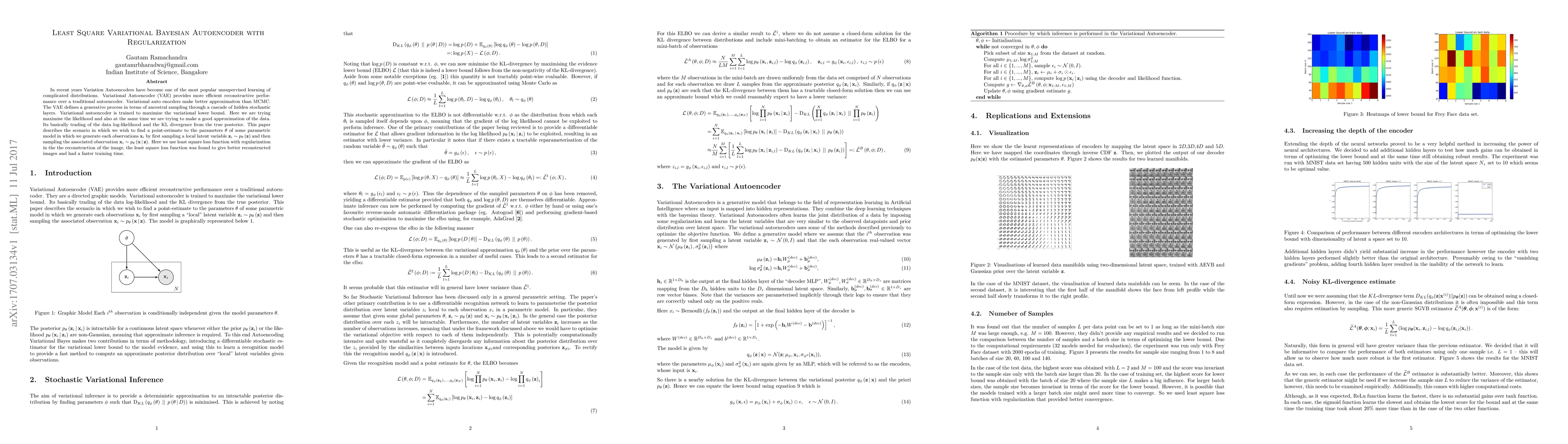 This paper proposes a Least Square Variational Bayesian Autoencoder with regularization to improve the reconstruction of images. It utilizes a least square loss function for better image reconstruction and faster training, compared to traditional autoencoders and MCMC methods.