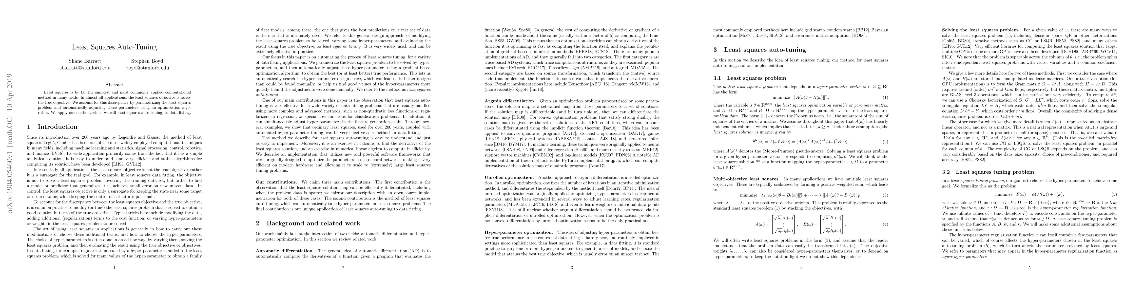 Summary: This paper introduces an auto-tuning method for least squares problems, which adjusts parameters to better fit the true objective, and applies it to data fitting to improve accuracy.