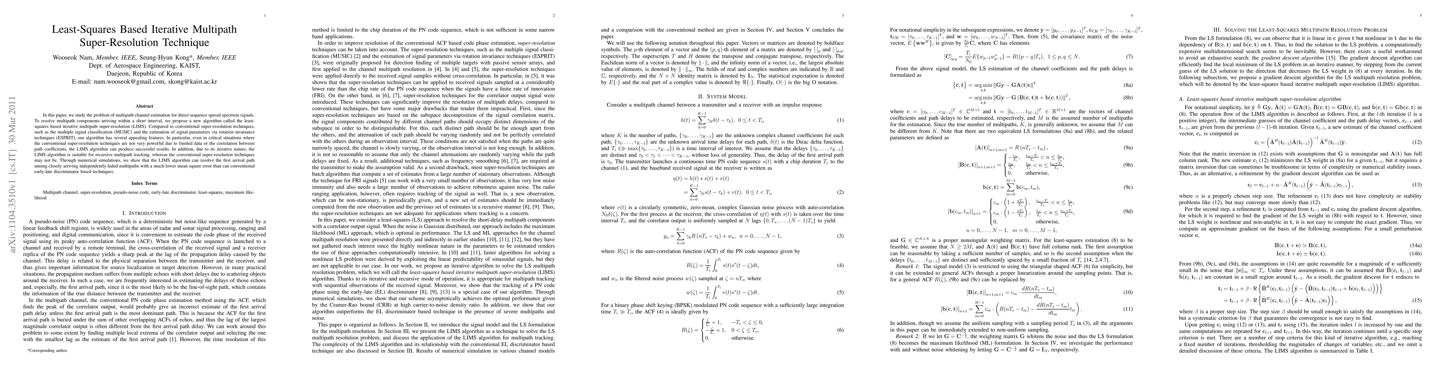 A new algorithm called LIMS improves multipath channel estimation for direct sequence spread spectrum signals by resolving closely arriving multipaths with lower mean square error than conventional techniques.