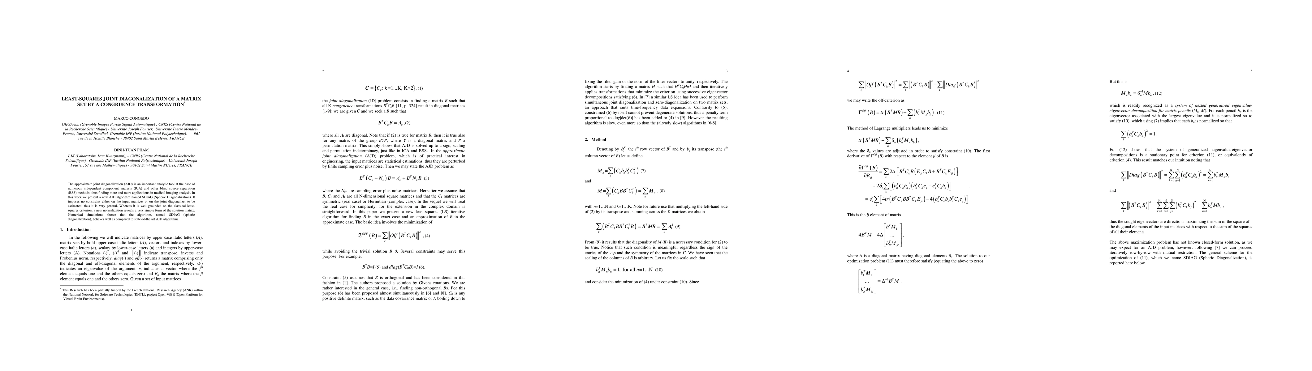 The approximate joint diagonalization (AJD) is an important analytic tool at the base of numerous independent component analysis (ICA) and other blind source separation (BSS) methods, thus finding more and more applications in medical imaging analysis. In this work we present a new AJD algorithm named SDIAG (Spheric Diagonalization). It imposes no constraint either on the input matrices or on the joint diagonalizer to be estimated, thus it is very general. Whereas it is well grounded on the classical leastsquares criterion, a new normalization reveals a very simple form of the solution matrix. Numerical simulations shown that the algorithm, named SDIAG (spheric diagonalization), behaves well as compared to state-of-the art AJD algorithms.