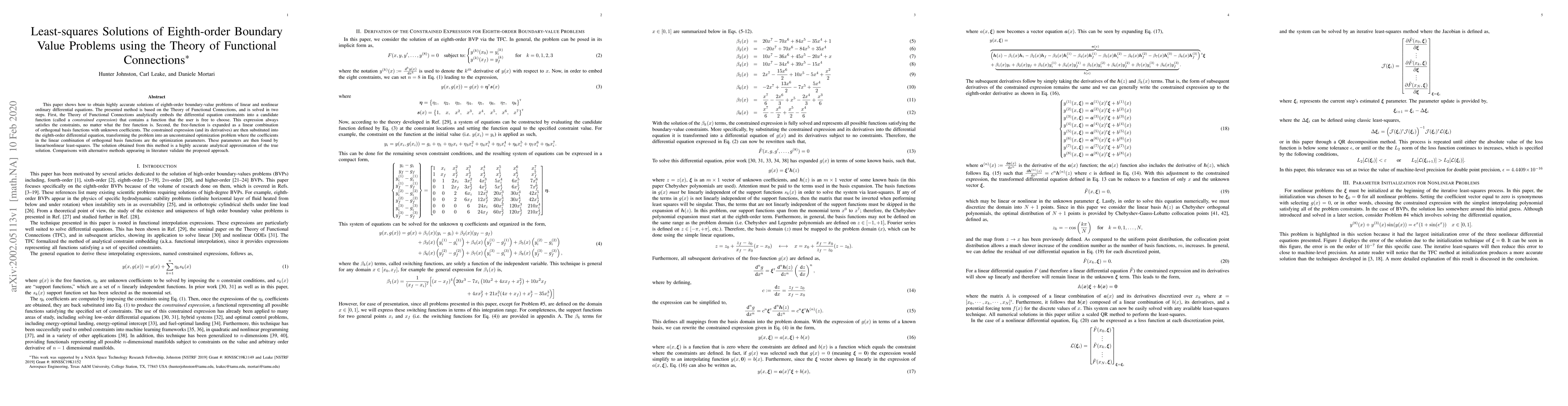 This paper shows how to obtain highly accurate solutions of eighth-order boundary-value problems of linear and nonlinear ordinary differential equations. The presented method is based on the Theory of Functional Connections, and is solved in two steps. First, the Theory of Functional Connections analytically embeds the differential equation constraints into a candidate function (called a $constrained \, expression$) that contains a function that the user is free to choose. This expression always satisfies the constraints, no matter what the free function is. Second, the free-function is expanded as a linear combination of orthogonal basis functions with unknown coefficients. The constrained expression (and its derivatives) are then substituted into the eighth-order differential equation, transforming the problem into an unconstrained optimization problem where the coefficients in the linear combination of orthogonal basis functions are the optimization parameters. These parameters are then found by linear/nonlinear least-squares. The solution obtained from this method is a highly accurate analytical approximation of the true solution. Comparisons with alternative methods appearing in literature validate the proposed approach.