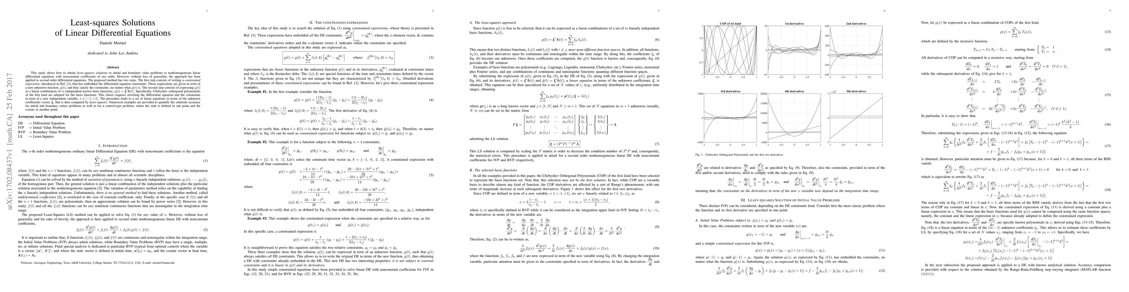 This study shows how to obtain least-squares solutions to initial and boundary value problems to nonhomogeneous linear differential equations with nonconstant coefficients of any order. However, without loss of generality, the approach has been applied to second order differential equations. The proposed method has two steps. The first step consists of writing a constrained expression, introduced in Ref. \cite{Mortari}, that has embedded the differential equation constraints. These expressions are given in term of a new unknown function, $g (t)$, and they satisfy the constraints, no matter what $g (t)$ is. The second step consists of expressing $g (t)$ as a linear combination of $m$ independent known basis functions, $g (t) = \mathbf{\xi}^T \mathbf{h} (t)$. Specifically, Chebyshev orthogonal polynomials of the first kind are adopted for the basis functions. This choice requires rewriting the differential equation and the constraints in term of a new independent variable, $x\in[-1, +1]$. The procedure leads to a set of linear equations in terms of the unknown coefficients vector, $\mathbf{\xi},$ that is then computed by least-squares. Numerical examples are provided to quantify the solutions accuracy for initial and boundary values problems as well as for a control-type problem, where the state is defined in one point and the costate in another point.