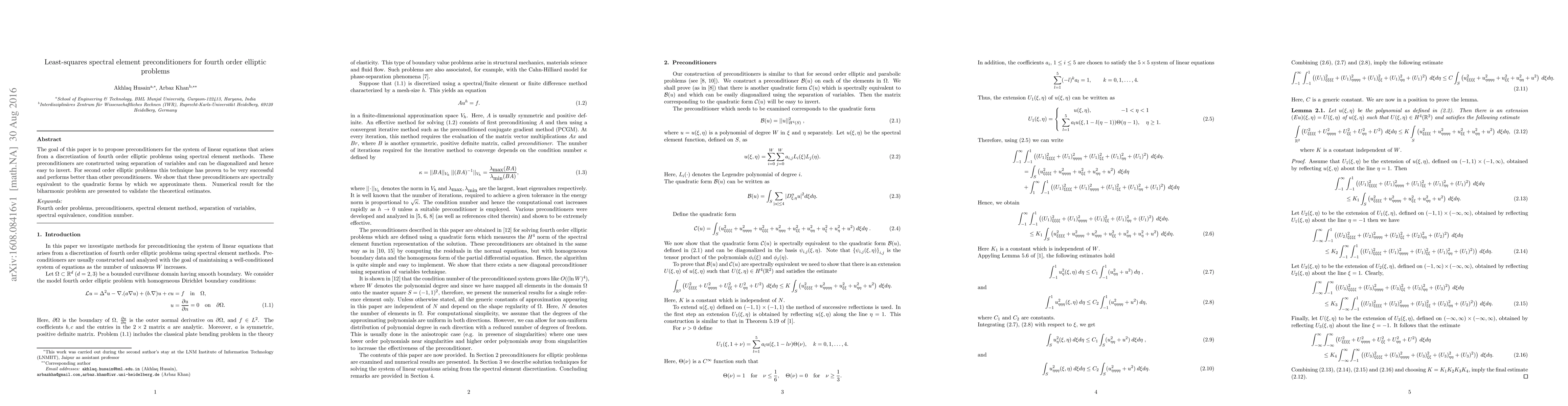 The goal of this paper is to propose preconditioners for the system of linear equations that arises from a discretization of fourth order elliptic problems using spectral element methods. These preconditioners are constructed using separation of variables and can be diagonalized and hence easy to invert. For second order elliptic problems this technique has proven to be very successful and performs better than other preconditioners. We show that these preconditioners are spectrally equivalent to the quadratic forms by which we approximate them. Numerical result for the biharmonic problem are presented to validate the theoretical estimates.