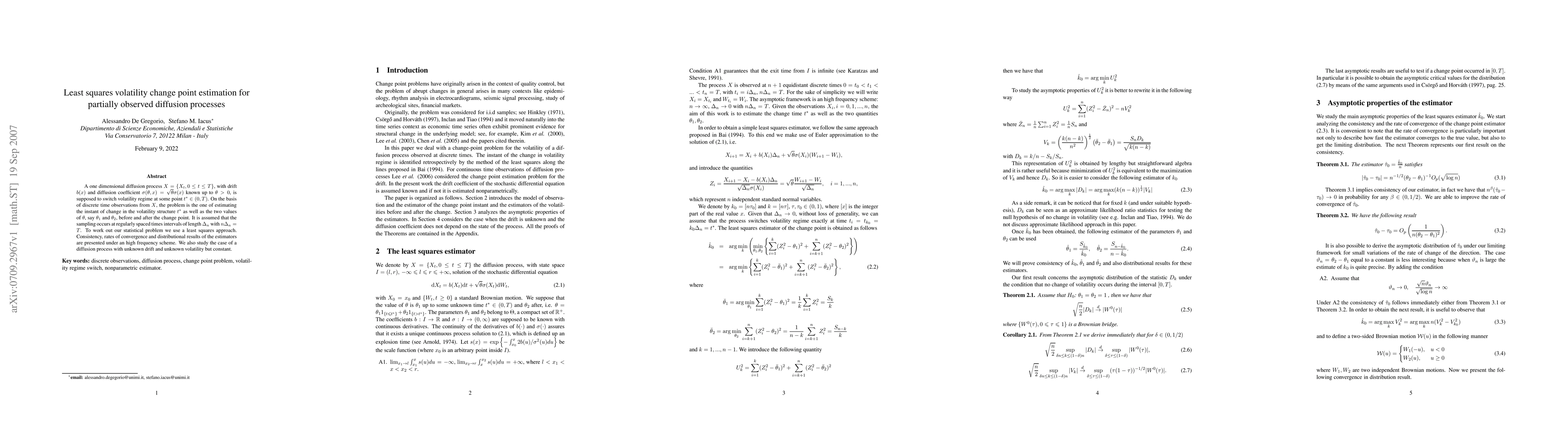 A one dimensional diffusion process $X=\{X_t, 0\leq t \leq T\}$, with drift $b(x)$ and diffusion coefficient $\sigma(\theta, x)=\sqrt{\theta} \sigma(x)$ known up to $\theta>0$, is supposed to switch volatility regime at some point $t^*\in (0,T)$. On the basis of discrete time observations from $X$, the problem is the one of estimating the instant of change in the volatility structure $t^*$ as well as the two values of $\theta$, say $\theta_1$ and $\theta_2$, before and after the change point. It is assumed that the sampling occurs at regularly spaced times intervals of length $\Delta_n$ with $n\Delta_n=T$. To work out our statistical problem we use a least squares approach. Consistency, rates of convergence and distributional results of the estimators are presented under an high frequency scheme. We also study the case of a diffusion process with unknown drift and unknown volatility but constant.