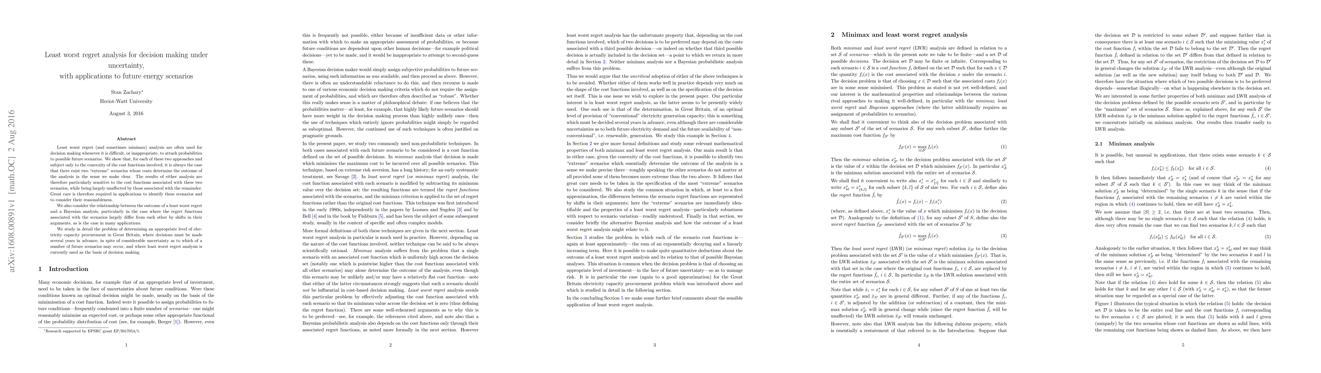 Least worst regret (and sometimes minimax) analysis are often used for decision making whenever it is difficult, or inappropriate, to attach probabilities to possible future scenarios. We show that, for each of these two approaches and subject only to the convexity of the cost functions involved, it is always the case that there exist two "extreme" scenarios whose costs determine the outcome of the analysis in the sense we make clear. The results of either analysis are therefore particularly sensitive to the cost functions associated with these two scenarios, while being largely unaffected by those associated with the remainder. Great care is therefore required in applications to identify these scenarios and to consider their reasonableness. We also consider the relationship between the outcome of a least worst regret and a Bayesian analysis, particularly in the case where the regret functions associated with the scenarios largely differ from each other by shifts in their arguments, as is the case in many applications. We study in detail the problem of determining an appropriate level of electricity capacity procurement in Great Britain, where decisions must be made several years in advance, in spite of considerable uncertainty as to which of a number of future scenarios may occur, and where least worst regret analysis is currently used as the basis of decision making.