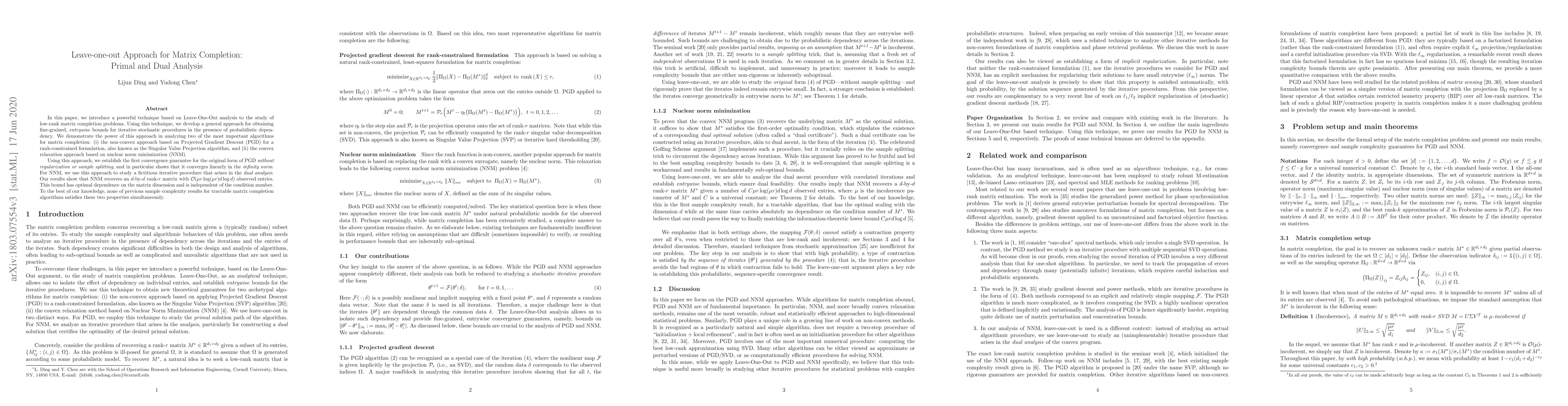 This paper introduces a Leave-one-out analysis technique to study low-rank matrix completion, providing fine-grained entrywise bounds for stochastic procedures. It establishes the first linear convergence guarantee for the original Projected Gradient Descent algorithm and presents an optimal sample complexity result for nuclear norm minimization, independent of the condition number.