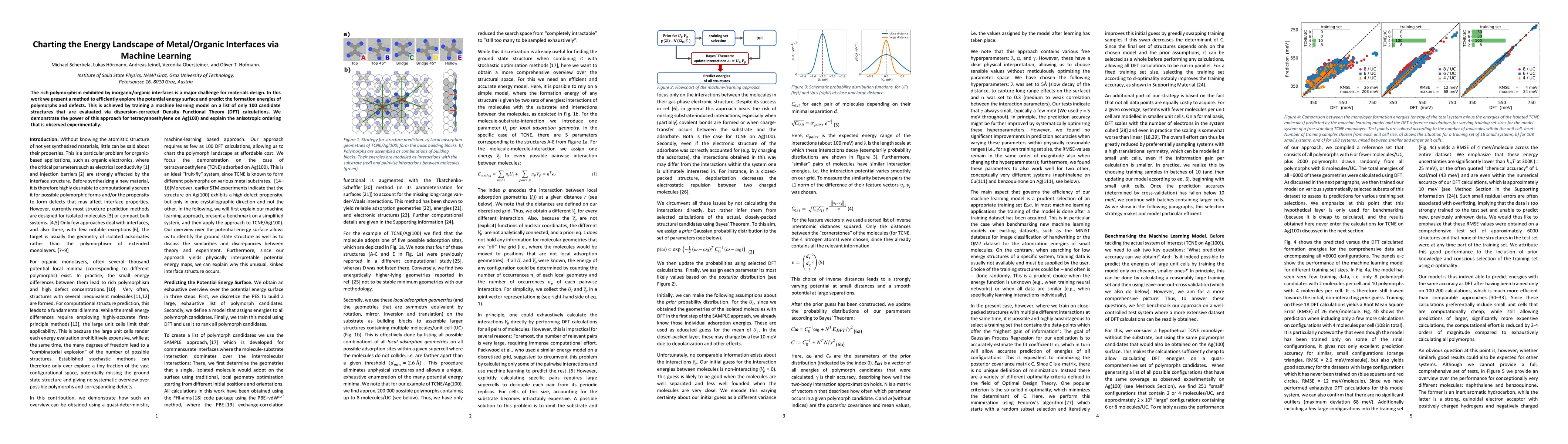 The rich polymorphism exhibited by inorganic/organic interfaces is a major challenge for materials design. In this work we present a method to efficiently explore the potential energy surface and predict the formation energies of polymorphs and defects. This is achieved by training a machine learning model on a list of only 100 candidate structures that are evaluated via dispersion-corrected Density Functional Theory (DFT) calculations. We demonstrate the power of this approach for tetracyanoethylene on Ag(100) and explain the anisotropic ordering that is observed experimentally.
