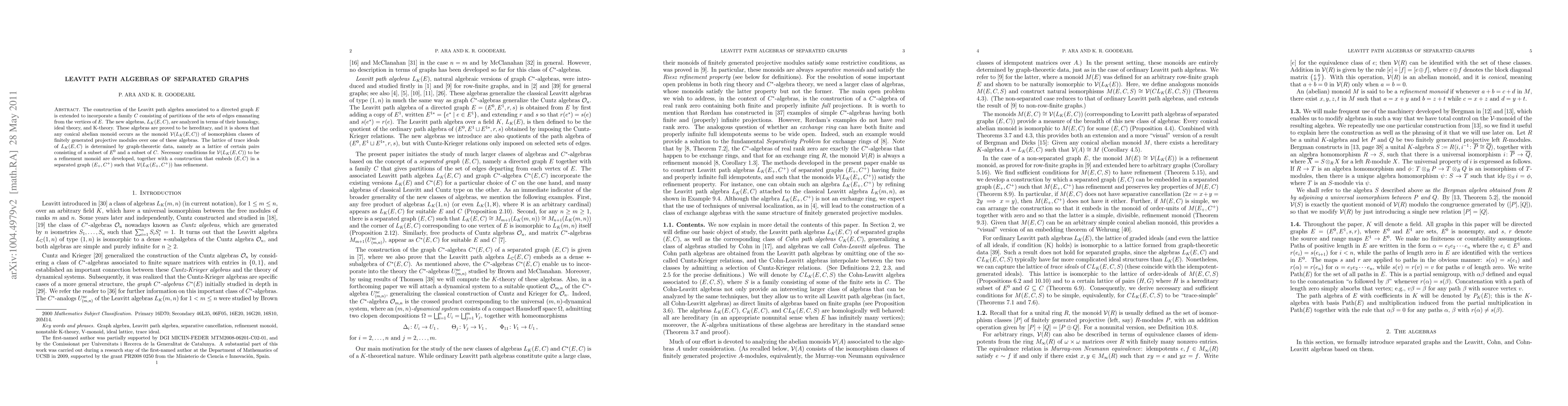 The paper introduces Leavitt path algebras for separated graphs with partitions of edges, analyzing their homology, ideal theory, K-theory, and embedding in refinement monoids.