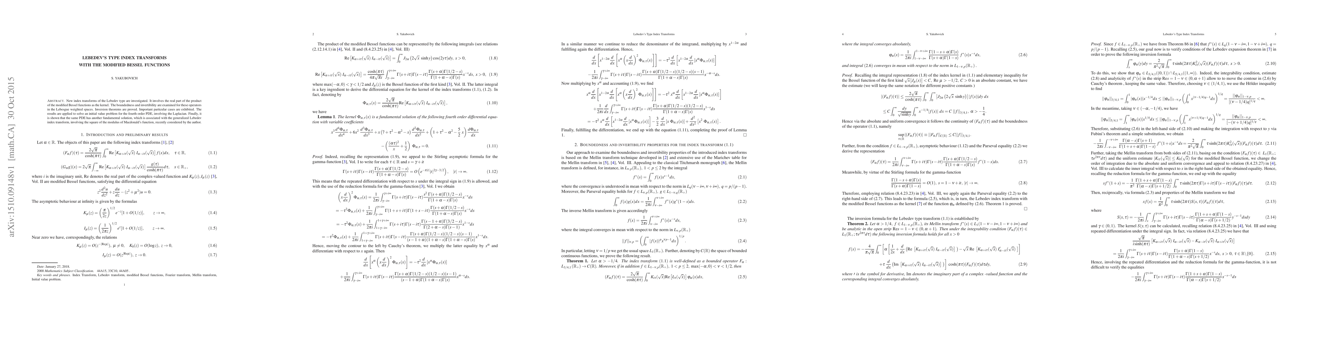 This paper introduces new Lebedev type index transforms using modified Bessel functions, proving their boundedness and invertibility in Lebesgue spaces. The study also applies these transforms to solve a fourth-order PDE involving the Laplacian and identifies another fundamental solution linked to the generalized Lebedev transform.