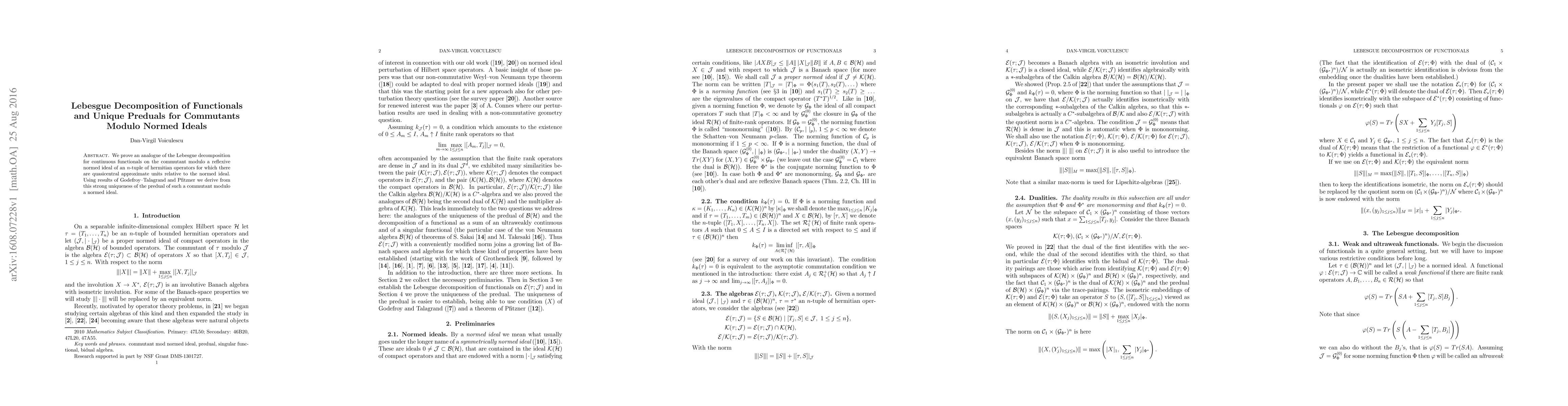 We prove an analogue of the Lebesgue decomposition for continuous functionals on the commutant modulo a reflexive normed ideal of an n-tuple of hermitian operators for which there are quasicentral approximate units relative to the normed ideal. Using results of Godefroy-Talagrand and Pfitzner we derive from this strong uniqueness of the predual of such a commutant modulo a normed ideal.