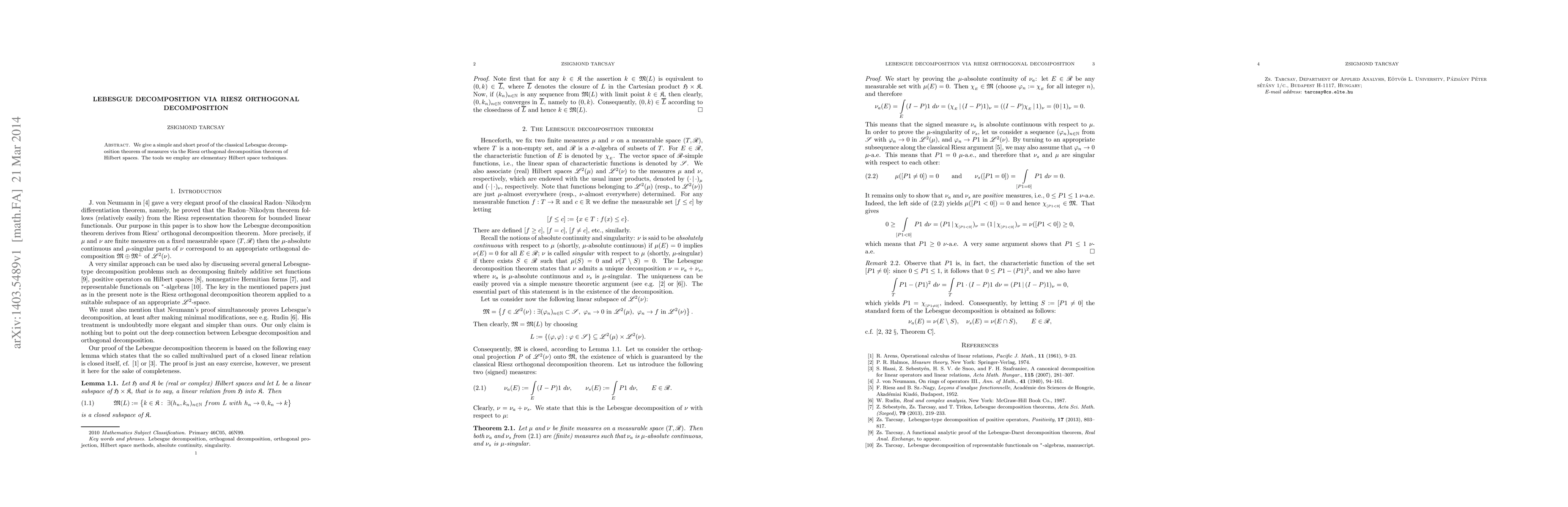 The paper provides a straightforward proof of the Lebesgue decomposition theorem using the Riesz orthogonal decomposition from Hilbert space theory, demonstrating the application of basic Hilbert space techniques.