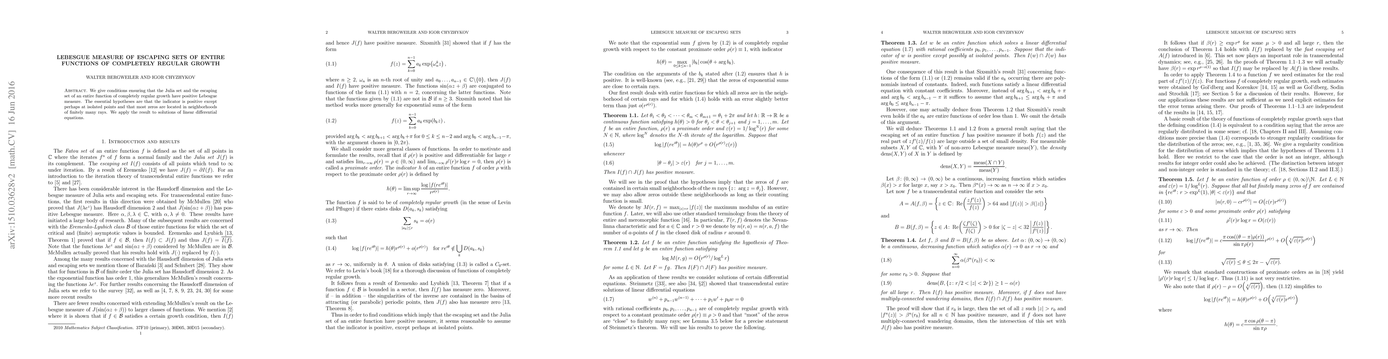 This paper establishes conditions for entire functions of completely regular growth to have Julia and escaping sets with positive Lebesgue measure, relying on the function's indicator properties and zero distribution. The findings are applied to solutions of linear differential equations.