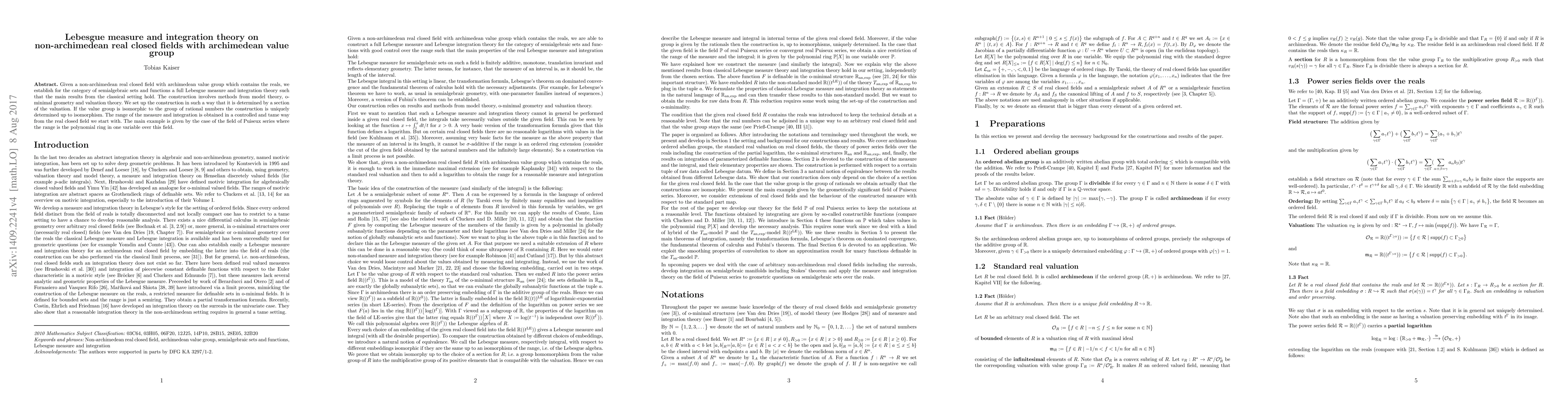 Given a non-archimedean real closed field with archimedean value group which contains the reals, we establish for the category of semialgebraic sets and functions a full Lebesgue measure and integration theory such that the main results from the classical setting hold. The construction involves methods from model theory, o-minimal geometry and valuation theory. We set up the construction in such a way that it is determined by a section of the valuation. If the value group is isomorphic to the group of rational numbers the construction is uniquely determined up to isomorphism. The range of the measure and integration is obtained in a controled and tame way from the real closed field we start with. The main example is given by the case of the field of Puiseux series where the range is the polynomial ring in one variable over this field.
