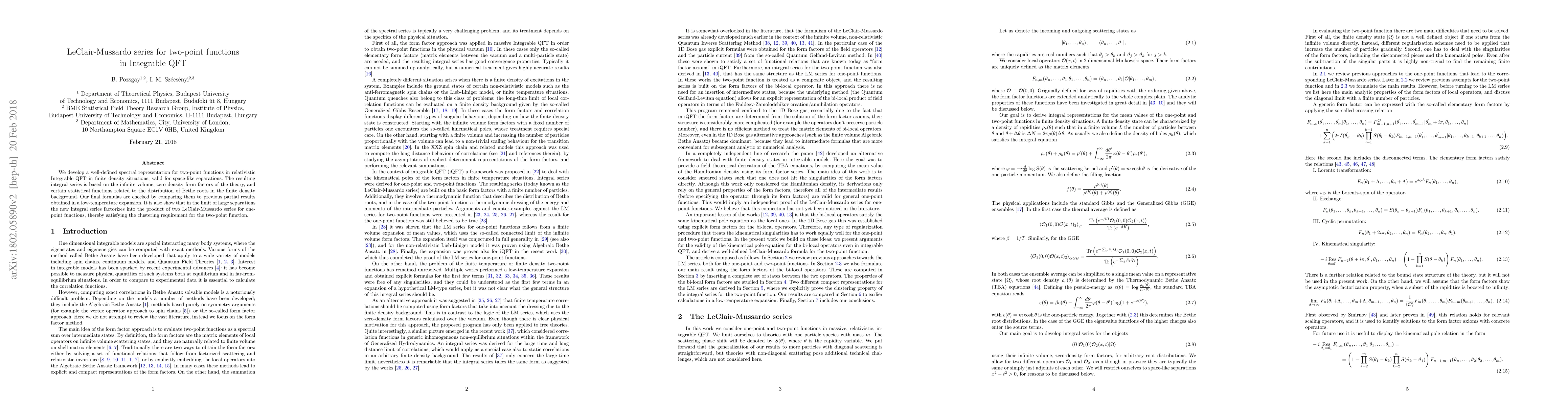 This paper develops a spectral representation for two-point functions in integrable quantum field theory (QFT) under finite density, utilizing the LeClair-Mussardo series. The results are validated against previous low-temperature expansions and show factorization into one-point functions in the large separation limit, satisfying clustering requirements.