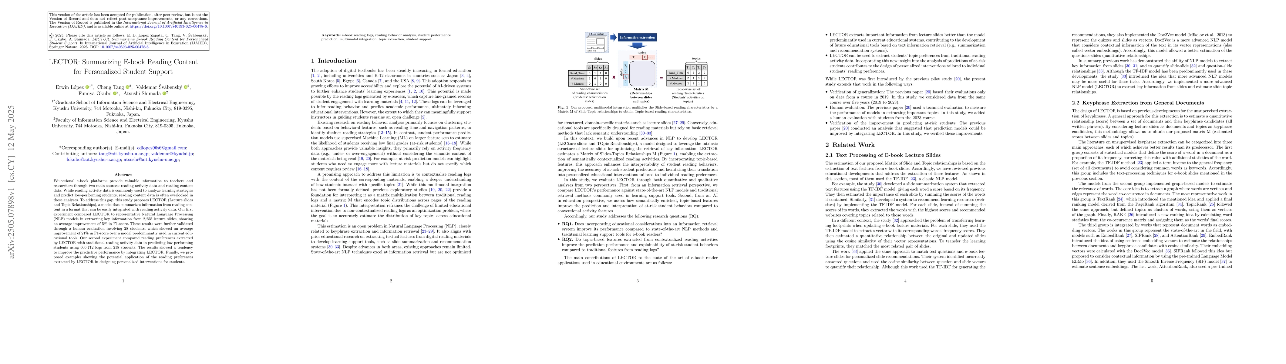 Educational e-book platforms provide valuable information to teachers and researchers through two main sources: reading activity data and reading content data. While reading activity data is commonly used to analyze learning strategies and predict low-performing students, reading content data is often overlooked in these analyses. To address this gap, this study proposes LECTOR (Lecture slides and Topic Relationships), a model that summarizes information from reading content in a format that can be easily integrated with reading activity data. Our first experiment compared LECTOR to representative Natural Language Processing (NLP) models in extracting key information from 2,255 lecture slides, showing an average improvement of 5% in F1-score. These results were further validated through a human evaluation involving 28 students, which showed an average improvement of 21% in F1-score over a model predominantly used in current educational tools. Our second experiment compared reading preferences extracted by LECTOR with traditional reading activity data in predicting low-performing students using 600,712 logs from 218 students. The results showed a tendency to improve the predictive performance by integrating LECTOR. Finally, we proposed examples showing the potential application of the reading preferences extracted by LECTOR in designing personalized interventions for students.