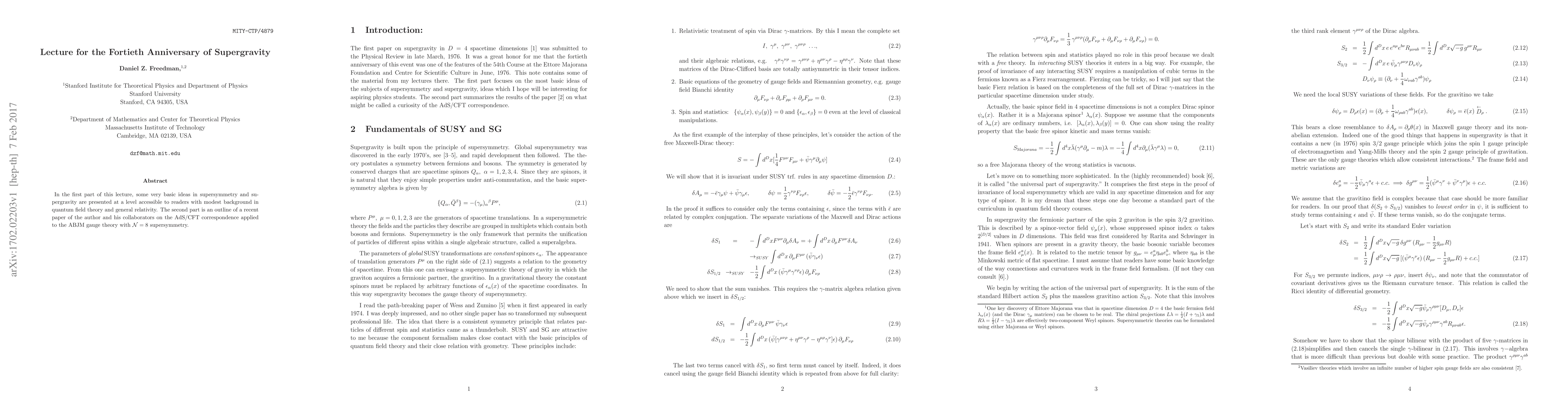 In the first part of this lecture, some very basic ideas in supersymmetry and supergravity are presented at a level accessible to readers with modest background in quantum field theory and general relativity. The second part is an outline of a recent paper of the author and his collaborators on the AdS/CFT correspondence applied to the ABJM gauge theory with $\cal{N} =8$ supersymmetry.