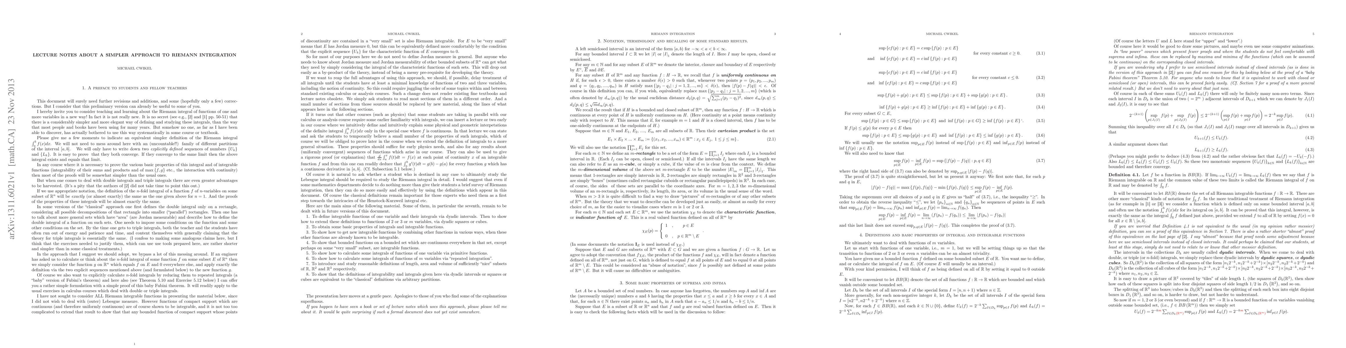 It is of course well known that the usual definitions of Riemann integration and Riemann integrals are equivalent to simpler definitions which can be expressed in terms of just one sequence of partitions, using dyadic intervals or dyadic squares or dyadic cubes for univariate, double, or triple integrals respectively. These lecture notes, intended mainly for undergraduates, present and prove some basic standard results of Riemann integration in detail, taking advantage of this simpler definition. The last section of the notes provides a proof of the equivalence of this definition with the classical one. But the implicit suggestion is that the classical definition need be the concern of specialists only, and that regular students can probably do just about everything that they need to do with Riemann integration by working only with the simpler dyadic definition. This is a preliminary version of these notes which will surely be updated later. It is very difficult to believe that there do not exist any other documents which give a systematic treatment of Riemann integration using this approach. The author would be very grateful for any information about any such documents.