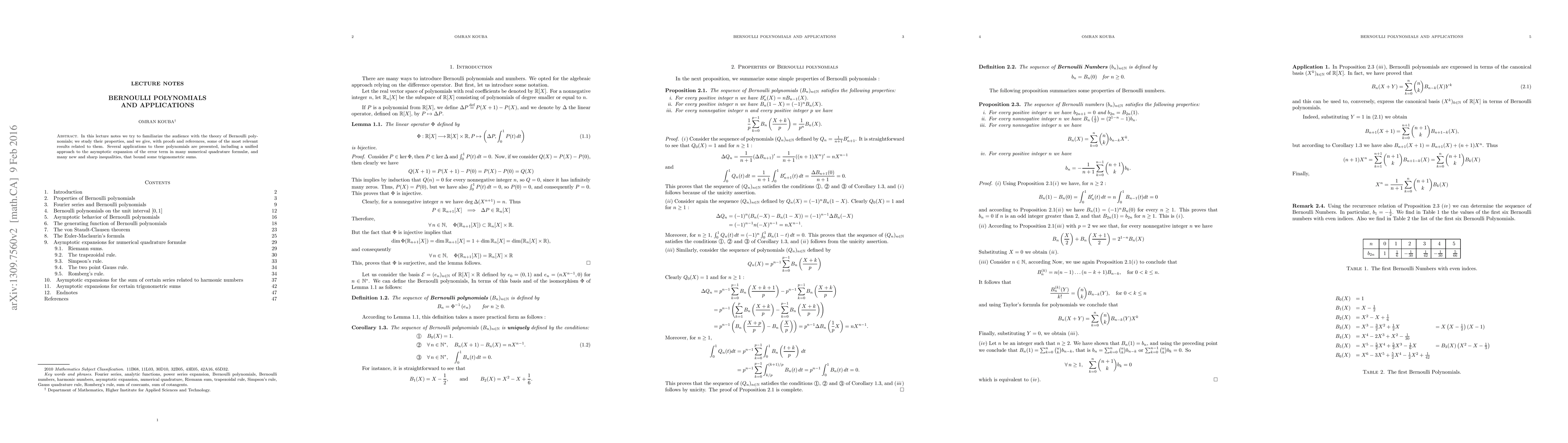 This lecture notes introduce Bernoulli polynomials, detailing their properties and relevant results, and explores their applications, including the asymptotic expansion of numerical quadrature error terms and new inequalities for trigonometric sums.