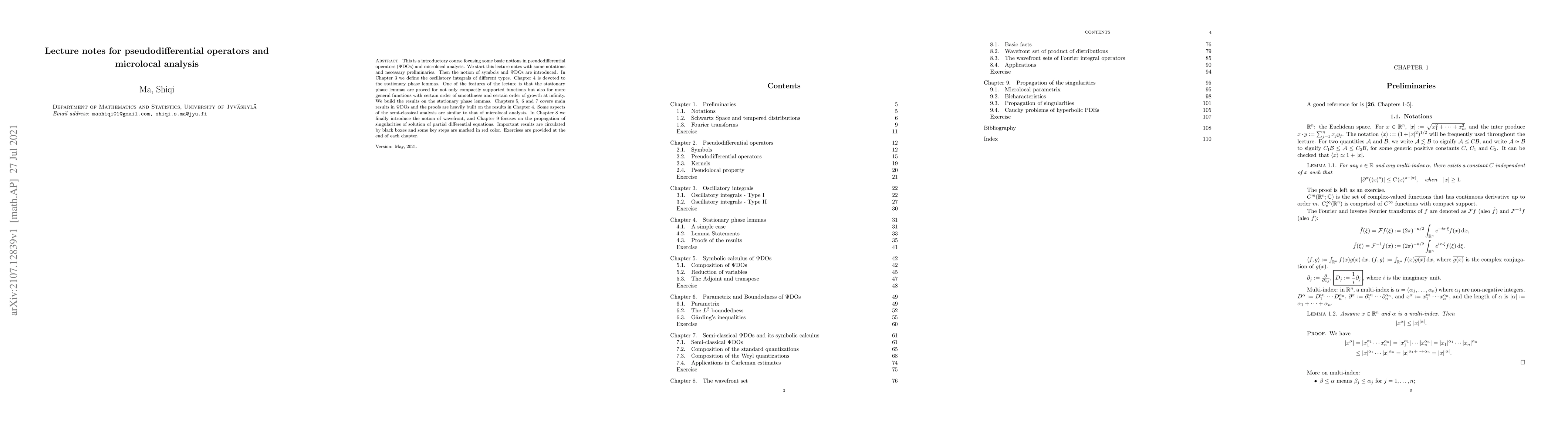 This is a introductory course focusing some basic notions in pseudodifferential operators ($\Psi$DOs) and microlocal analysis. We start this lecture notes with some notations and necessary preliminaries. Then the notion of symbols and $\Psi$DOs are introduced. In Chapter 3 we define the oscillatory integrals of different types. Chapter 4 is devoted to the stationary phase lemmas. One of the features of the lecture is that the stationary phase lemmas are proved for not only compactly supported functions but also for more general functions with certain order of smoothness and certain order of growth at infinity. We build the results on the stationary phase lemmas. Chapters 5, 6 and 7 covers main results in $\Psi$DOs and the proofs are heavily built on the results in Chapter 4. Some aspects of the semi-classical analysis are similar to that of microlocal analysis. In Chapter 8 we finally introduce the notion of wavefront, and Chapter 9 focuses on the propagation of singularities of solution of partial differential equations. Important results are circulated by black boxes and some key steps are marked in red color. Exercises are provided at the end of each chapter.