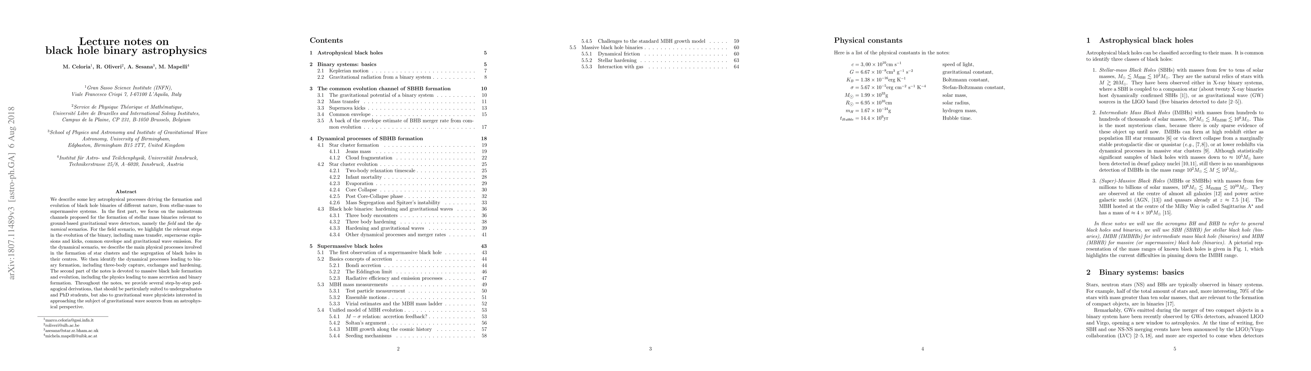 We describe some key astrophysical processes driving the formation and evolution of black hole binaries of different nature, from stellar-mass to supermassive systems. In the first part, we focus on the mainstream channels proposed for the formation of stellar mass binaries relevant to ground-based gravitational wave detectors, namely the {\it field} and the {\it dynamical} scenarios. For the field scenario, we highlight the relevant steps in the evolution of the binary, including mass transfer, supernovae explosions and kicks, common envelope and gravitational wave emission. For the dynamical scenario, we describe the main physical processes involved in the formation of star clusters and the segregation of black holes in their centres. We then identify the dynamical processes leading to binary formation, including three-body capture, exchanges and hardening. The second part of the notes is devoted to massive black hole formation and evolution, including the physics leading to mass accretion and binary formation. Throughout the notes, we provide several step-by-step pedagogical derivations, that should be particularly suited to undergraduates and PhD students, but also to gravitational wave physicists interested in approaching the subject of gravitational wave sources from an astrophysical perspective.