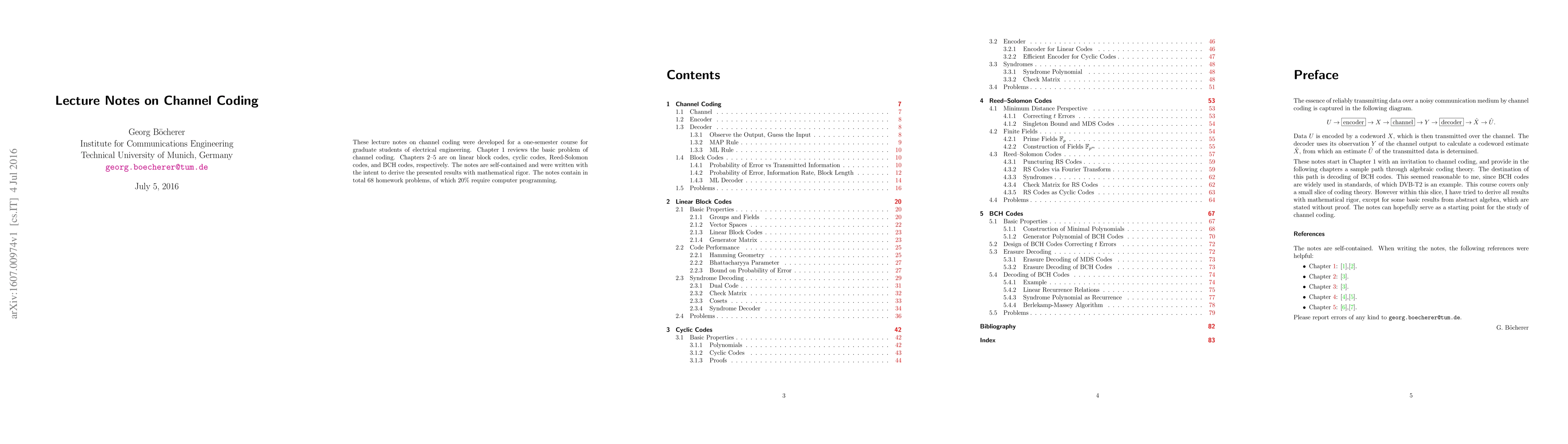 Concise Summary: This set of lecture notes covers fundamental channel coding concepts and detailed studies of linear block, cyclic, Reed-Solomon, and BCH codes for graduate electrical engineering students. The comprehensive, mathematically rigorous content includes 68 homework problems, with 20% emphasizing computer programming.