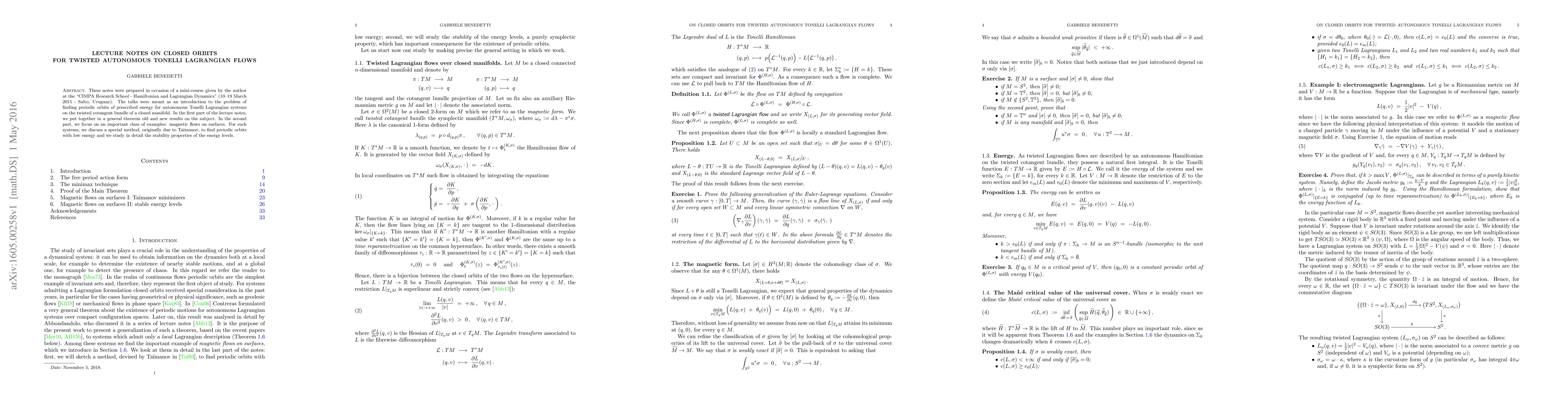 These lecture notes introduce periodic orbits in autonomous Tonelli Lagrangian systems, particularly focusing on twisted cotangent bundles and magnetic flows on surfaces. The author combines existing theorems and presents a specialized method for identifying low-energy periodic orbits, alongside an analysis of their stability properties.