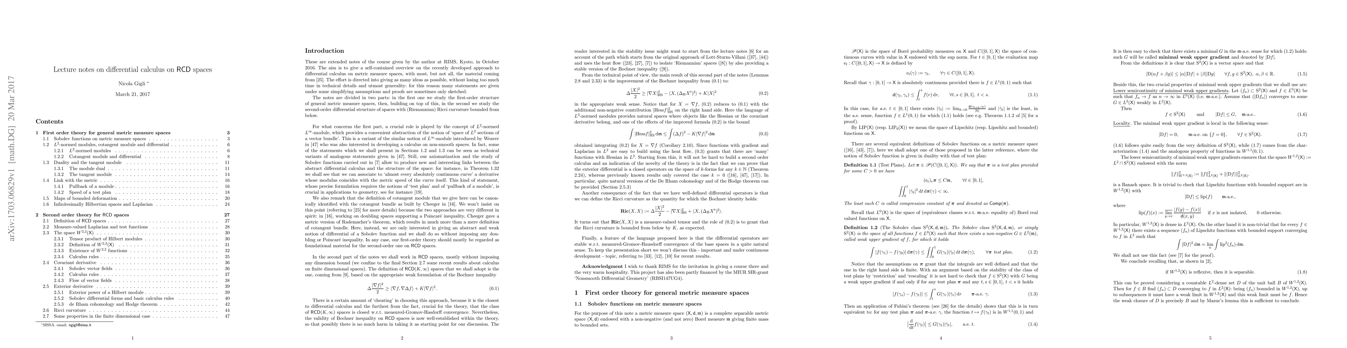 These are extended notes of the course given by the author at RIMS, Kyoto, in October 2016. The aim is to give a self-contained overview on the recently developed approach to differential calculus on metric measure spaces. The effort is directed into giving as many ideas as possible, without losing too much time in technical details and utmost generality: for this reason many statements are given under some simplifying assumptions and proofs are sometimes only sketched.