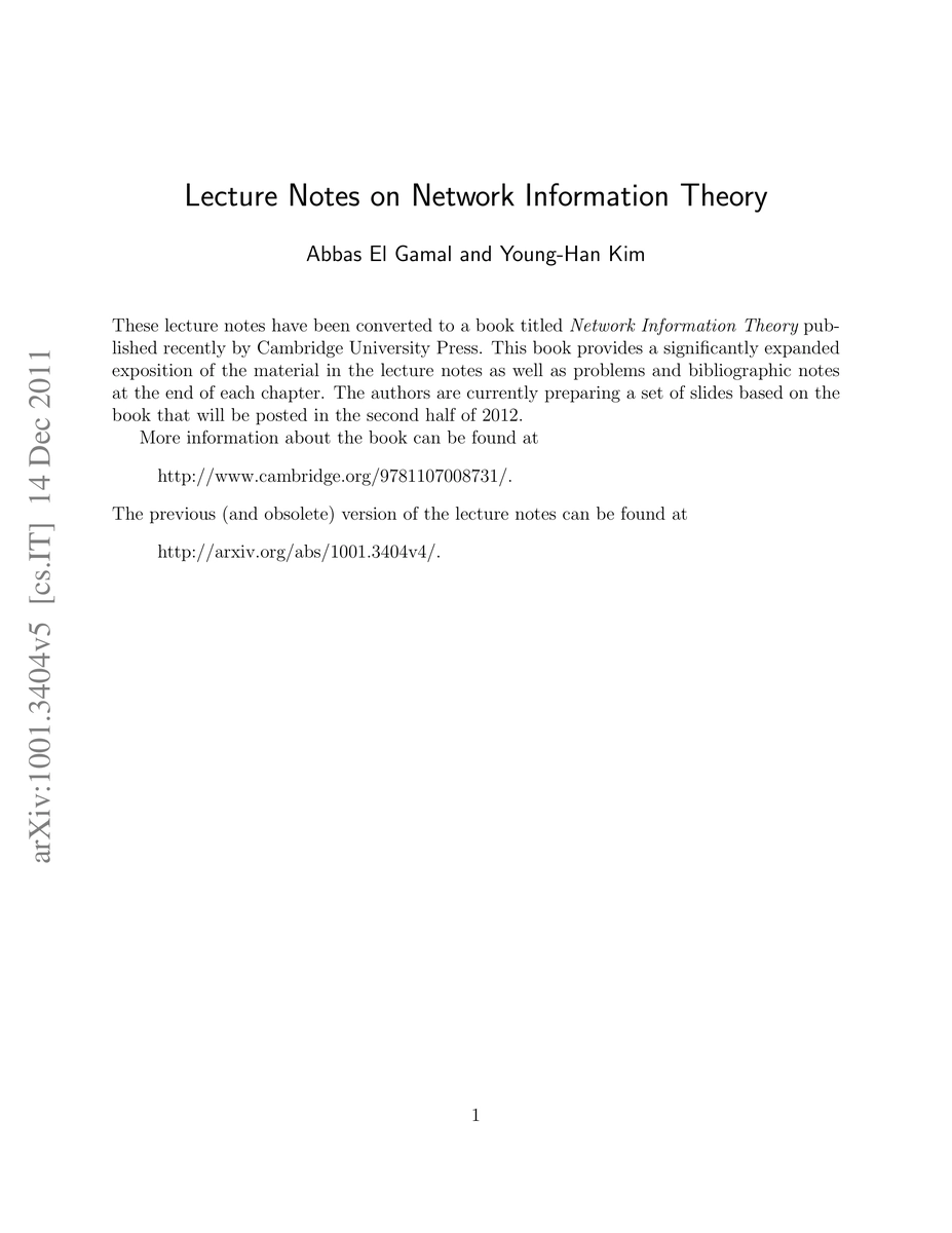 This book, "Network Information Theory," offers an expanded version of lecture notes on network information theory, enriched with problems and bibliographic notes per chapter. The authors plan to release slides based on the book in the latter half of 2012. For more details, visit the Cambridge University Press website.