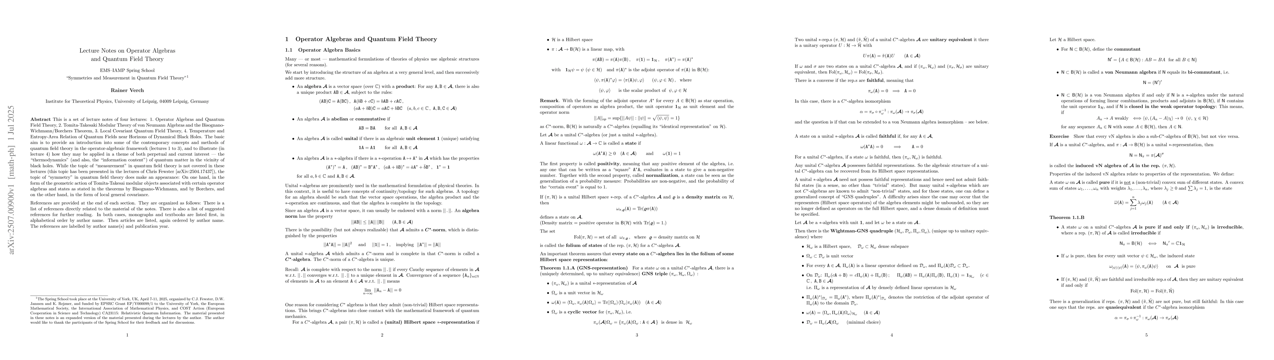 Lecture notes prepared for the EMS--IAMP Spring School ``Symmetries and Measurement in Quantum Field Theory''. This set of lecture notes covers four lectures: 1. Operator Algebras and Quantum Field Theory, 2. Tomita-Takesaki Modular Theory of von Neumann Algebras and the Bisognano-Wichmann/Borchers Theorem, 3. Local Covariant Quantum Field Theory, 4. Temperature and Entropy-Area Relation of Quantum Fields near Horizons of Dynamical Black Holes. The basic aim is to provide an introduction into some of the contemporary concepts and methods of quantum field theory in the operator-algebraic framework (lectures 1 to 3), and to illustrate (in lecture 4) how they may be applied in a theme of both perpetual and current interest - the ``thermodynamics'' (and also, the ``information content'') of quantum matter in the vicinity of black holes. While the topic of ``measurement'' in quantum field theory is not covered in these lectures (this topic has been presented in the lectures of Chris Fewster [arXiv:2504.17437]), the topic of``symmetry'' in quantum field theory does make an appearance: On one hand, in the form of the geometric action of Tomita-Takesai modular objects associated with certain operator algebras and states as stated in the theorems by Bisognano-Wichmann, and by Borchers, and on the other hand, in the form of local general covariance. The Spring School took place at the University of York, UK, April 7-11, 2025, organized by C.J. Fewster, D.W. Janssen and K. Rejzner, and funded by EPSRC Grant EP/Y000099/1 to the University of York, the European Mathematical Society, the International Association of Mathematical Physics, and COST Action (European Cooperation in Science and Technology) CA23115: Relativistic Quantum Information. The material presented in these notes is an expanded version of the material presented during the lectures by the author.