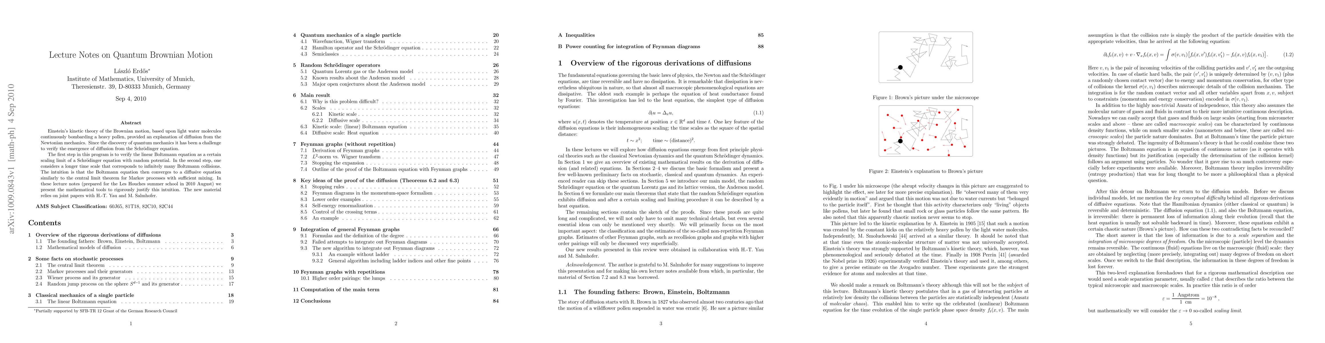 Einstein's kinetic theory of the Brownian motion, based upon light water molecules continuously bombarding a heavy pollen, provided an explanation of diffusion from the Newtonian mechanics. Since the discovery of quantum mechanics it has been a challenge to verify the emergence of diffusion from the Schr\"odinger equation. The first step in this program is to verify the linear Boltzmann equation as a certain scaling limit of a Schr\"odinger equation with random potential. In the second step, one considers a longer time scale that corresponds to infinitely many Boltzmann collisions. The intuition is that the Boltzmann equation then converges to a diffusive equation similarly to the central limit theorem for Markov processes with sufficient mixing. In these lecture notes (prepared for the Les Houches summer school in 2010 August) we present the mathematical tools to rigorously justify this intuition. The new material relies on joint papers with H.-T. Yau and M. Salmhofer.