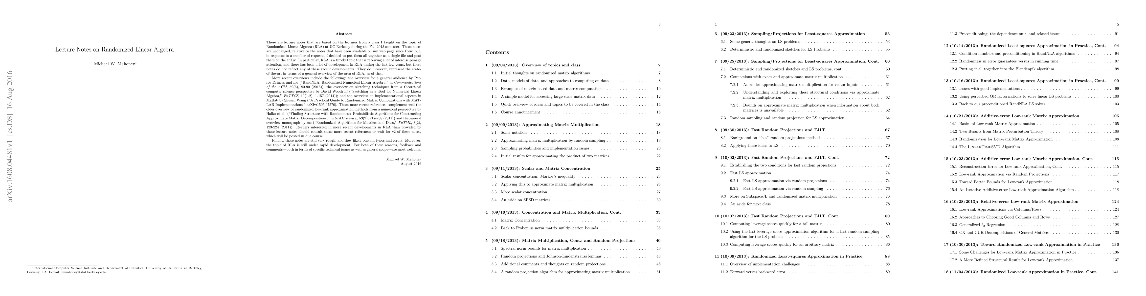 This document compiles lecture notes from a UC Berkeley course on Randomized Linear Algebra (RLA) taught in Fall 2013, focusing on applying probabilistic techniques to linear algebra problems for efficiency and scalability.