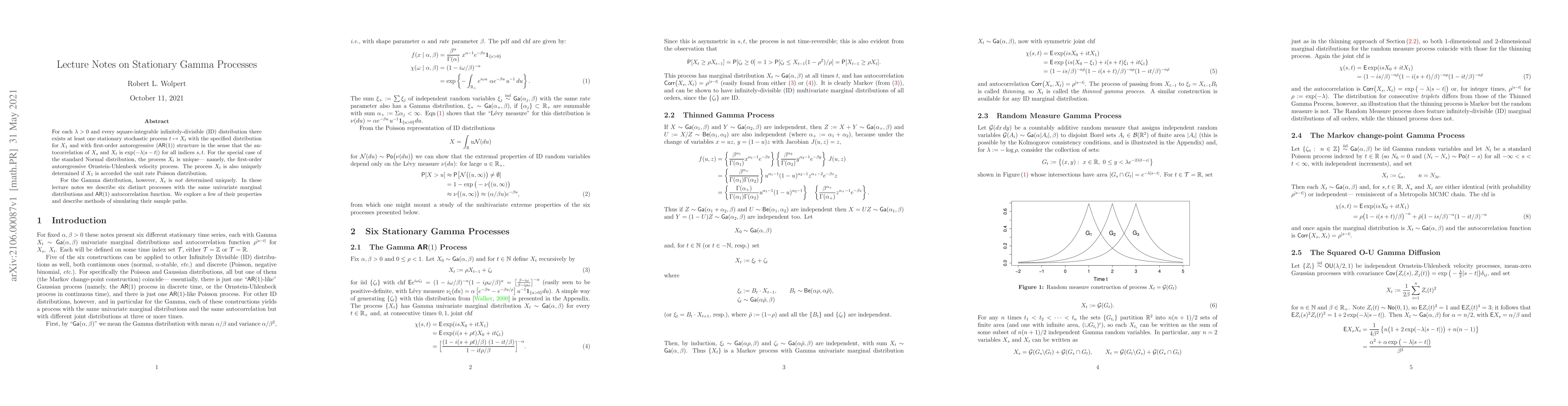 For each $\lambda>0$ and every square-integrable infinitely-divisible (ID) distribution there exists at least one stationary stochastic process $t\mapsto X_t$ with the specified distribution for $X_1$ and with first-order autoregressive (AR(1)) structure in the sense that the autocorrelation of $X_s$ and $X_t$ is $\exp(-\lambda|s-t|)$ for all indices $s,t$. For the special case of the standard Normal distribution, the process $X_t$ is unique -- namely, the first-order autoregressive Ornstein-Uhlenbeck velocity process. The process $X_t$ is also uniquely determined if $X_1$ is accorded the unit rate Poisson distribution. For the Gamma distribution, however, $X_t$ is \emph{not} determined uniquely. In these lecture notes we describe six distinct processes with the same univariate marginal distributions and AR(1) autocorrelation function. We explore a few of their properties and describe methods of simulating their sample paths.