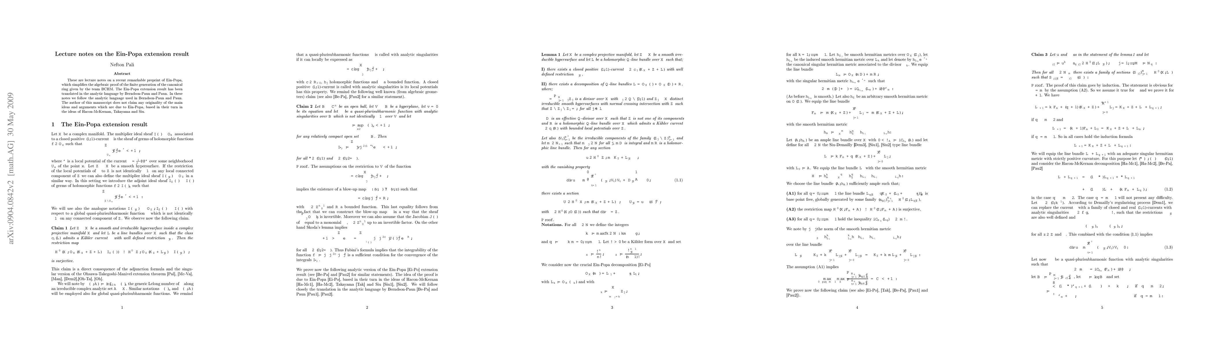 These lecture notes elucidate the Ein-Popa extension result, which simplifies the algebraic proof of the finite generation of the canonical ring, originally developed by the BCHM team. The notes follow the analytic translation of the result by Berndson-Paun and Paun, acknowledging the foundational contributions of Ein-Popa, Hacon-McKernan, Takayama, and Siu.