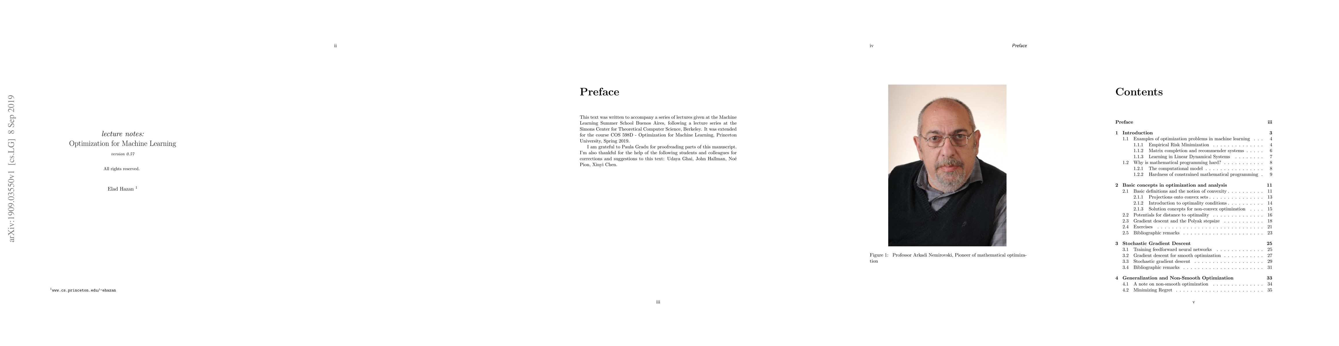 This paper compiles lecture notes on optimization techniques for machine learning, sourced from Princeton University courses and tutorials held at MLSS Buenos Aires and the Simons Foundation in Berkeley. It aims to provide a comprehensive overview of optimization methods crucial for improving machine learning models.