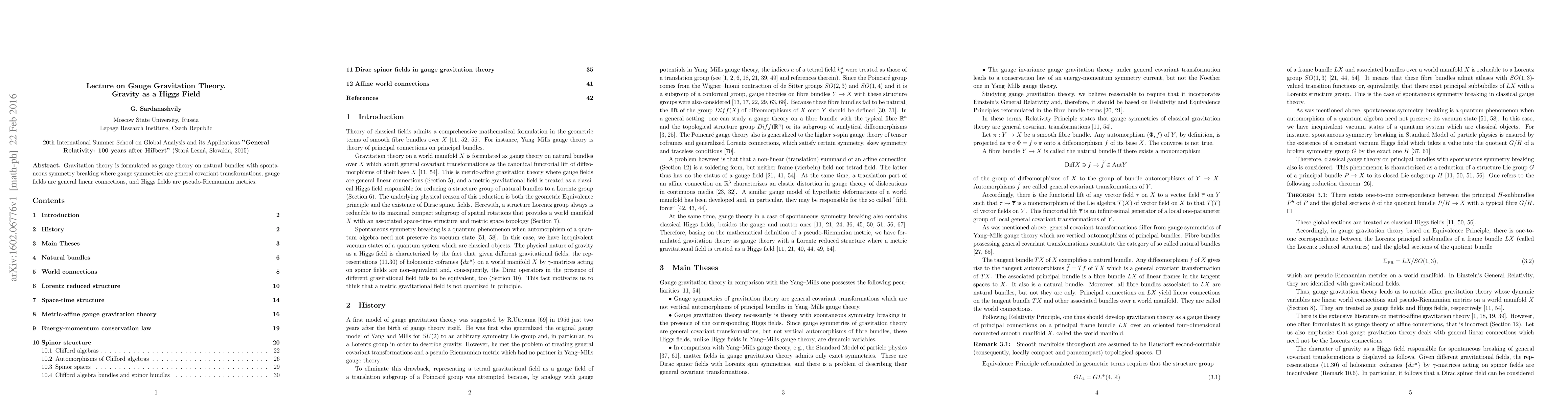Gravitation theory is formulated as gauge theory on natural bundles with spontaneous symmetry breaking where gauge symmetries are general covariant transformations, gauge fields are general linear connections, and Higgs fields are pseudo-Riemannian metrics.