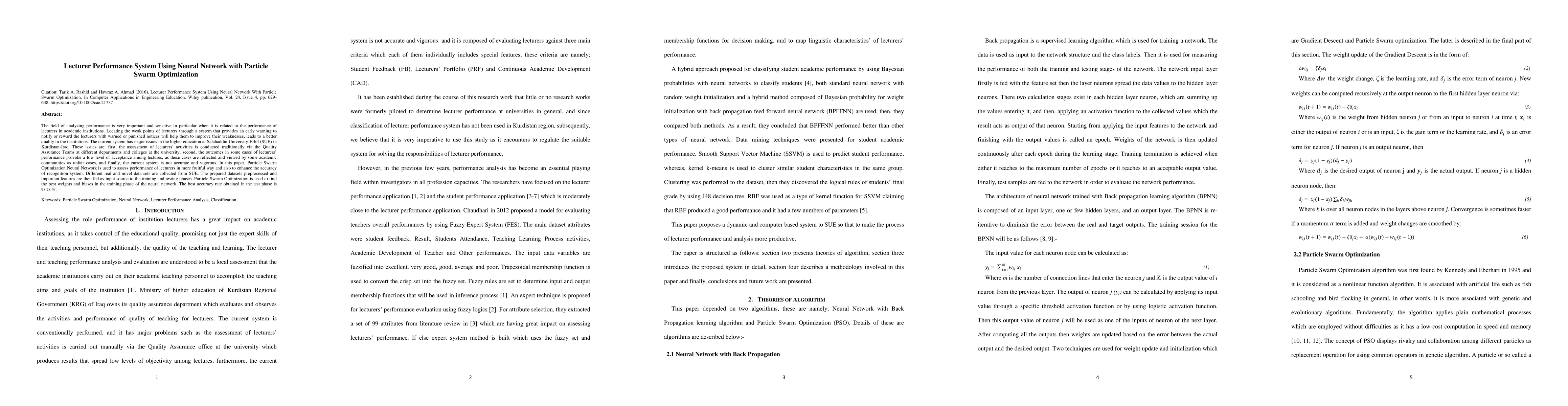 The field of analyzing performance is very important and sensitive in particular when it is related to the performance of lecturers in academic institutions. Locating the weak points of lecturers through a system that provides an early warning to notify or reward the lecturers with warned or punished notices will help them to improve their weaknesses, leads to a better quality in the institutions. The current system has major issues in the higher education at Salahaddin University-Erbil (SUE) in Kurdistan-Iraq. These issues are: first, the assessment of lecturers' activities is conducted traditionally via the Quality Assurance Teams at different departments and colleges at the university, second, the outcomes in some cases of lecturers' performance provoke a low level of acceptance among lectures, as these cases are reflected and viewed by some academic communities as unfair cases, and finally, the current system is not accurate and vigorous. In this paper, Particle Swarm Optimization Neural Network is used to assess performance of lecturers in more fruitful way and also to enhance the accuracy of recognition system. Different real and novel data sets are collected from SUE. The prepared datasets preprocessed and important features are then fed as input source to the training and testing phases. Particle Swarm Optimization is used to find the best weights and biases in the training phase of the neural network. The best accuracy rate obtained in the test phase is 98.28 %.