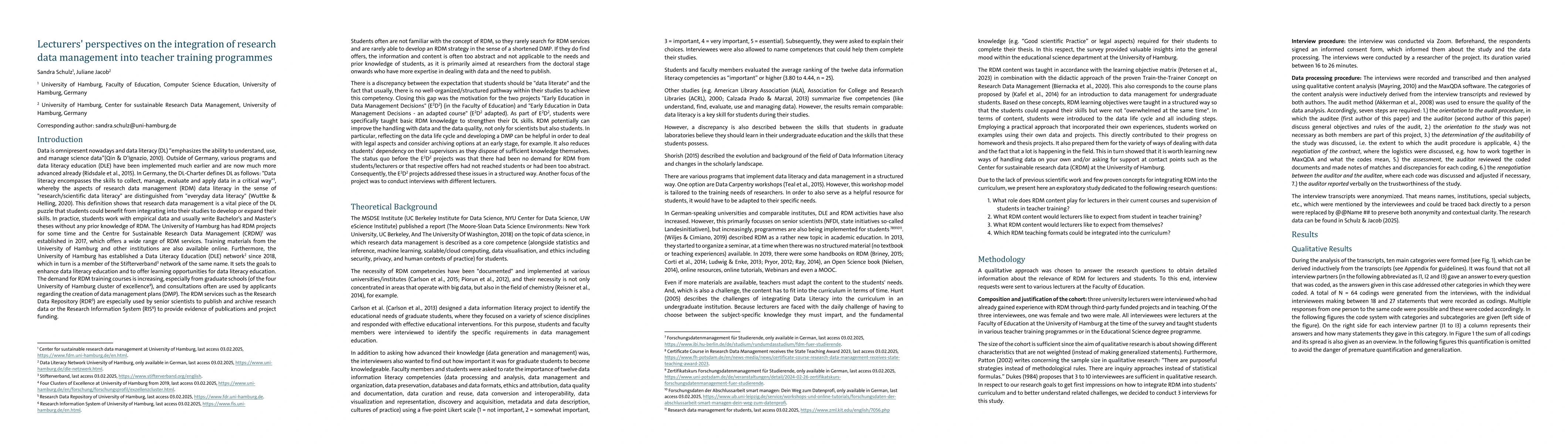 This article focuses on how data literacy education such as research data management skills can be integrated into teacher training programmes in order to adequately train the teachers of tomorrow. To this end, interviews were conducted with three lecturers from the Faculty of Education and analysed both qualitatively and quantitatively. The lecturers describe the topic of research data management as extremely relevant for students, especially in the Master's program. Even as future teachers, for example in computer science and the natural sciences, students will have a lot to do with data and need to be able to handle it competently. The article also discusses how research data management skills can be integrated into the teacher training program.