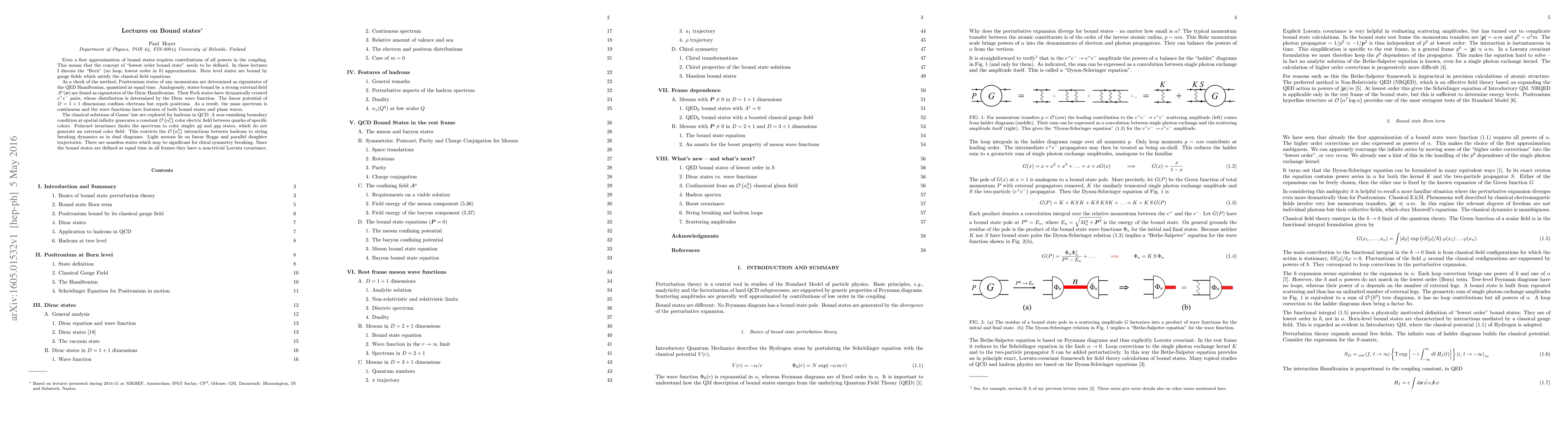 Even a first approximation of bound states requires contributions of all powers in the coupling. This means that the concept of "lowest order bound state" needs to be defined. In these lectures I discuss the "Born" (no loop, lowest order in $\hbar$) approximation. Born level states are bound by gauge fields which satisfy the classical field equations. As a check of the method, Positronium states of any momentum are determined as eigenstates of the QED Hamiltonian, quantized at equal time. Analogously, states bound by a strong external field $A^\mu(\boldsymbol{x})$ are found as eigenstates of the Dirac Hamiltonian. Their Fock states have dynamically created $e^+e^-$ pairs, whose distribution is determined by the Dirac wave function. The linear potential of $D=1+1$ dimensions confines electrons but repels positrons. As a result, the mass spectrum is continuous and the wave functions have features of both bound states and plane waves. The classical solutions of Gauss' law are explored for hadrons in QCD. A non-vanishing boundary condition at spatial infinity generates a constant \order{\alpha_s^0} color electric field between quarks of specific colors. Poincar\'e invariance limits the spectrum to color singlet $q\bar q$ and $qqq$ states, which do not generate an external color field. This restricts the \order{\alpha_s^0} interactions between hadrons to string breaking dynamics as in dual diagrams. Light mesons lie on linear Regge and parallel daughter trajectories. There are massless states which may be significant for chiral symmetry breaking. Since the bound states are defined at equal time in all frames they have a non-trivial Lorentz covariance.