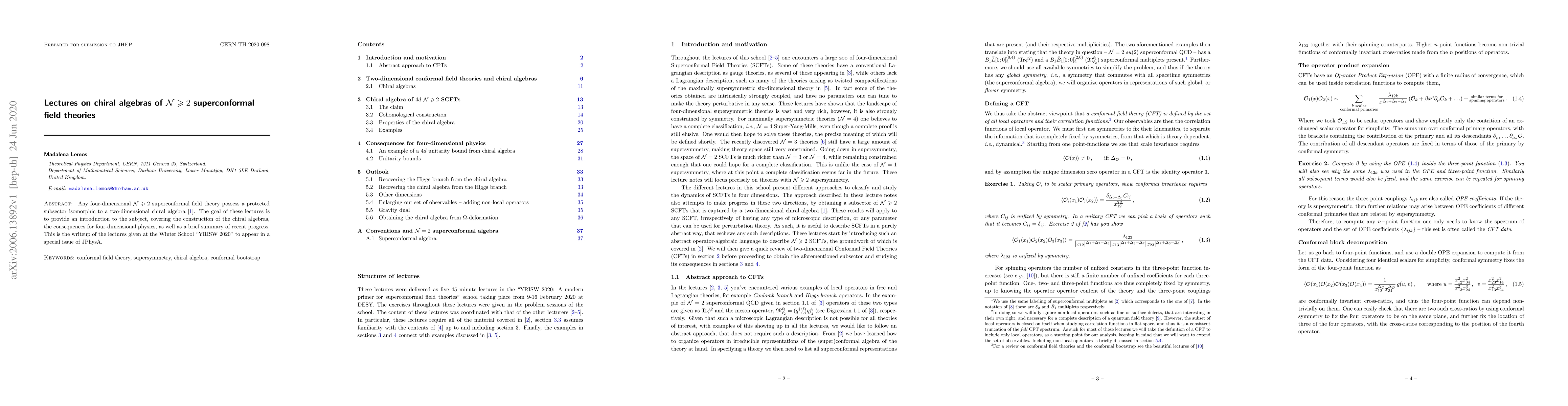 Lectures introduce chiral algebras in 2D superconformal field theories, which are protected subsectors of 4D $ abla geqslant 2$ theories, with implications for physics and recent progress.