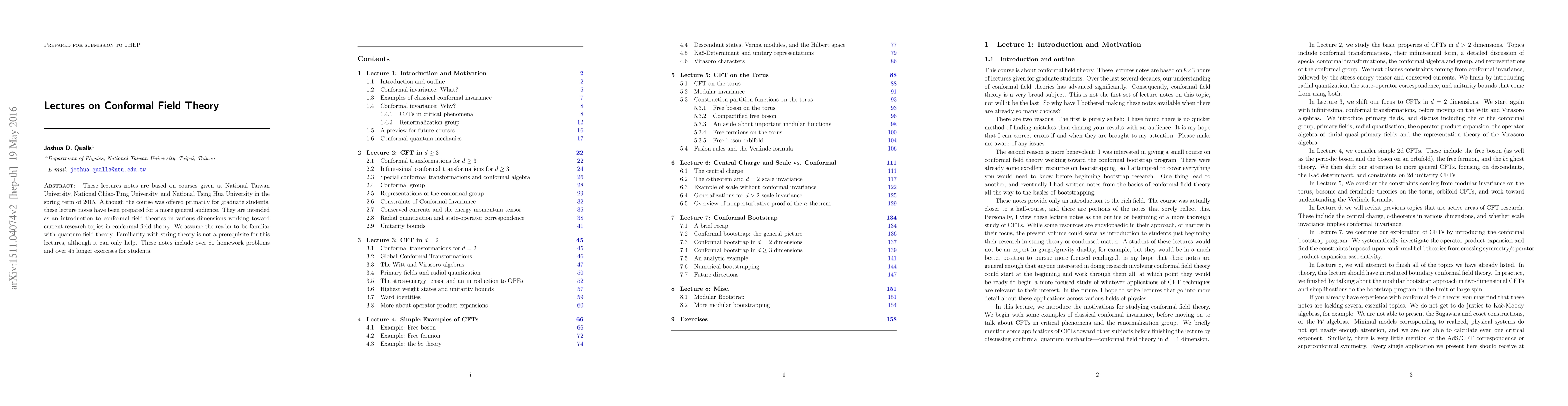 These lectures notes are based on courses given at National Taiwan University, National Chiao-Tung University, and National Tsing Hua University in the spring term of 2015. Although the course was offered primarily for graduate students, these lecture notes have been prepared for a more general audience. They are intended as an introduction to conformal field theories in various dimensions, with applications related to topics of particular interest: topics include the conformal bootstrap program, boundary conformal field theory, and applications related to the AdS/CFT correspondence. We assume the reader to be familiar with quantum mechanics at the graduate level and to have some basic knowledge of quantum field theory. Familiarity with string theory is not a prerequisite for this lectures, although it can only help.