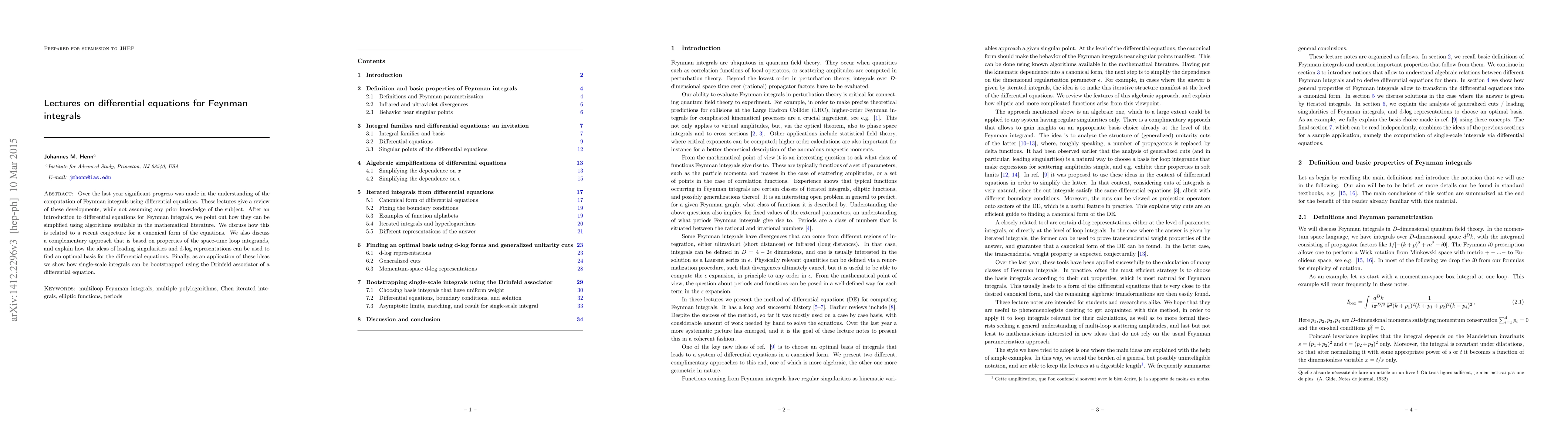 Over the last year significant progress was made in the understanding of the computation of Feynman integrals using differential equations. These lectures give a review of these developments, while not assuming any prior knowledge of the subject. After an introduction to differential equations for Feynman integrals, we point out how they can be simplified using algorithms available in the mathematical literature. We discuss how this is related to a recent conjecture for a canonical form of the equations. We also discuss a complementary approach that allows based on properties of the space-time loop integrands, and explain how the ideas of leading singularities and d-log representations can be used to find an optimal basis for the differential equations. Finally, as an application of the differential equations method we show how single-scale integrals can be bootstrapped using the Drinfeld associator of a differential equation.