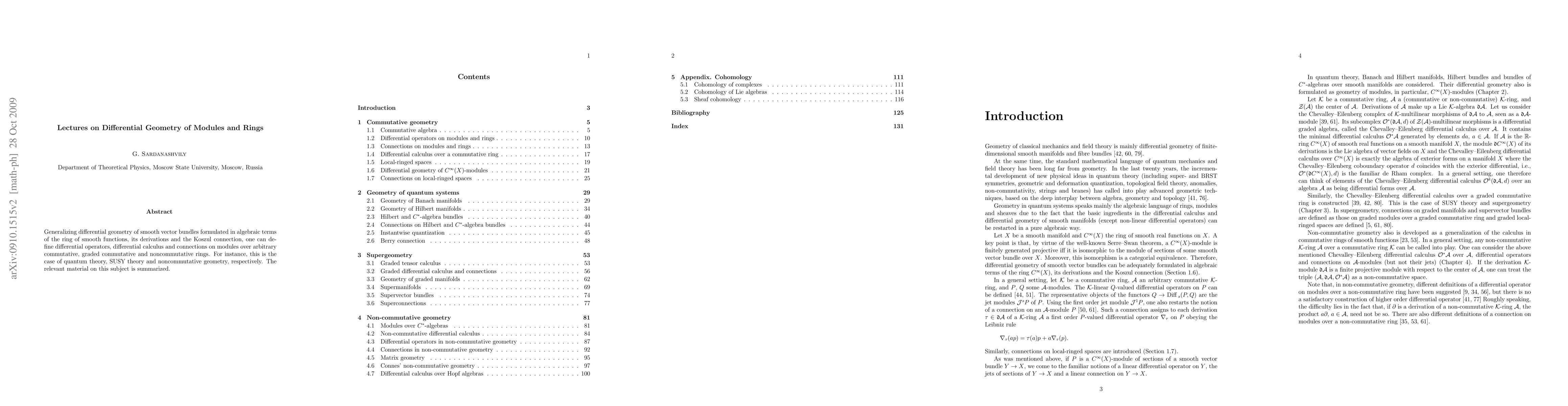 This paper generalizes differential geometry to modules over various types of rings, including commutative, graded commutative, and noncommutative rings, providing tools for differential calculus and connections in quantum theory, SUSY theory, and noncommutative geometry.