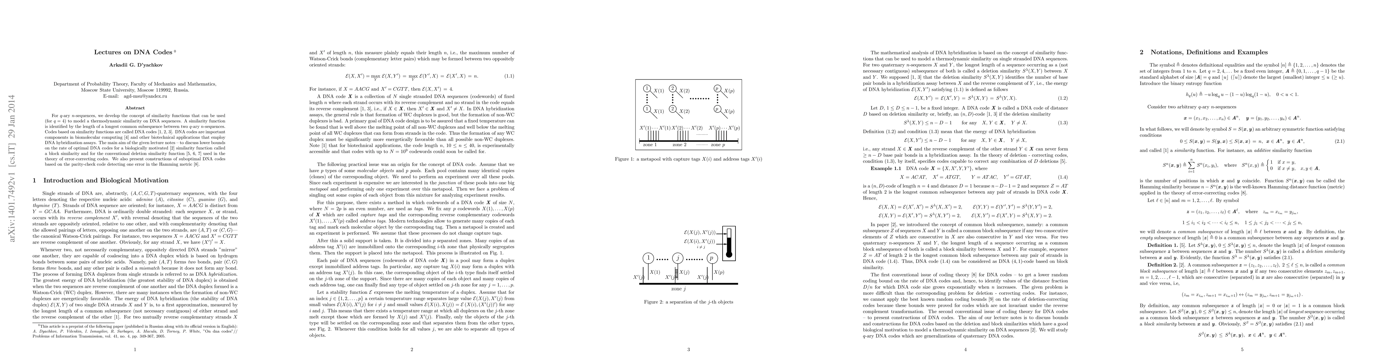 For $q$-ary $n$-sequences, we develop the concept of similarity functions that can be used (for $q=4$) to model a thermodynamic similarity on DNA sequences. A similarity function is identified by the length of a longest common subsequence between two $q$-ary $n$-sequences. Codes based on similarity functions are called DNA codes. DNA codes are important components in biomolecular computing and other biotechnical applications that employ DNA hybridization assays. The main aim of the given lecture notes -- to discuss lower bounds on the rate of optimal DNA codes for a biologically motivated similarity function called a block similarity and for the conventional deletion similarity function used in the theory of error-correcting codes. We also present constructions of suboptimal DNA codes based on the parity-check code detecting one error in the Hamming metric.