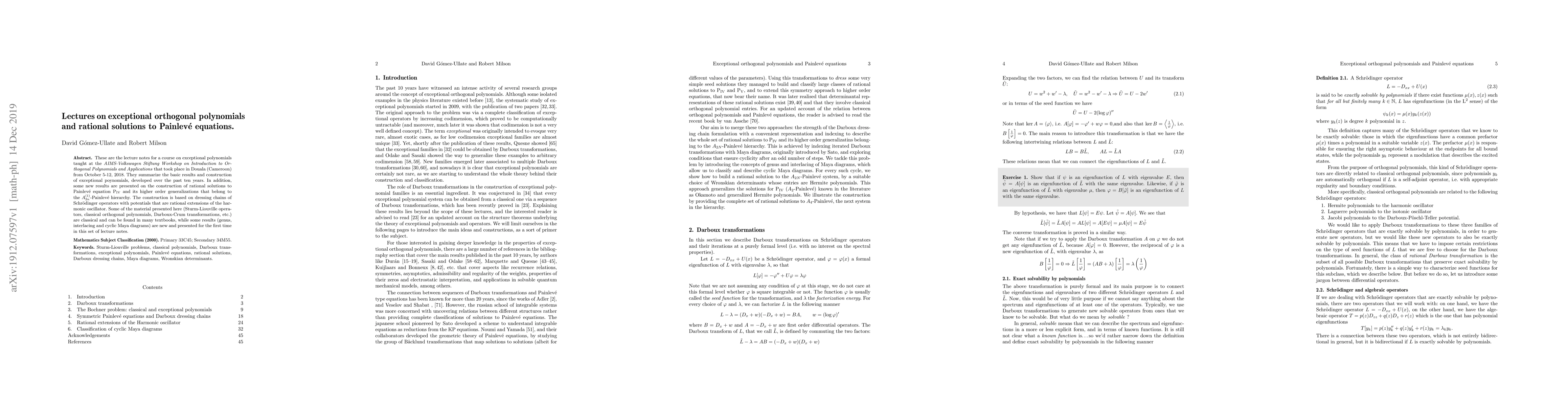 These are the lecture notes for a course on exceptional polynomials taught at the \textit{AIMS-Volkswagen Stiftung Workshop on Introduction to Orthogonal Polynomials and Applications} that took place in Douala (Cameroon) from October 5-12, 2018. They summarize the basic results and construction of exceptional poynomials, developed over the past ten years. In addition, some new results are presented on the construction of rational solutions to Painlev\'e equation PIV and its higher order generalizations that belong to the $A_{2n}^{(1)}$-Painlev\'e hierarchy. The construction is based on dressing chains of Schr\"odinger operators with potentials that are rational extensions of the harmonic oscillator. Some of the material presented here (Sturm-Liouville operators, classical orthogonal polynomials, Darboux-Crum transformations, etc.) are classical and can be found in many textbooks, while some results (genus, interlacing and cyclic Maya diagrams) are new and presented for the first time in this set of lecture notes.